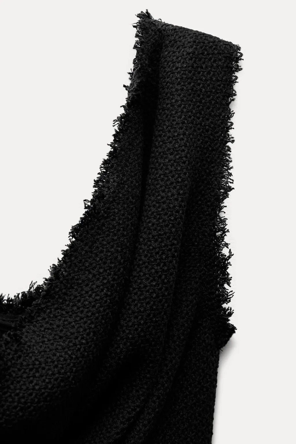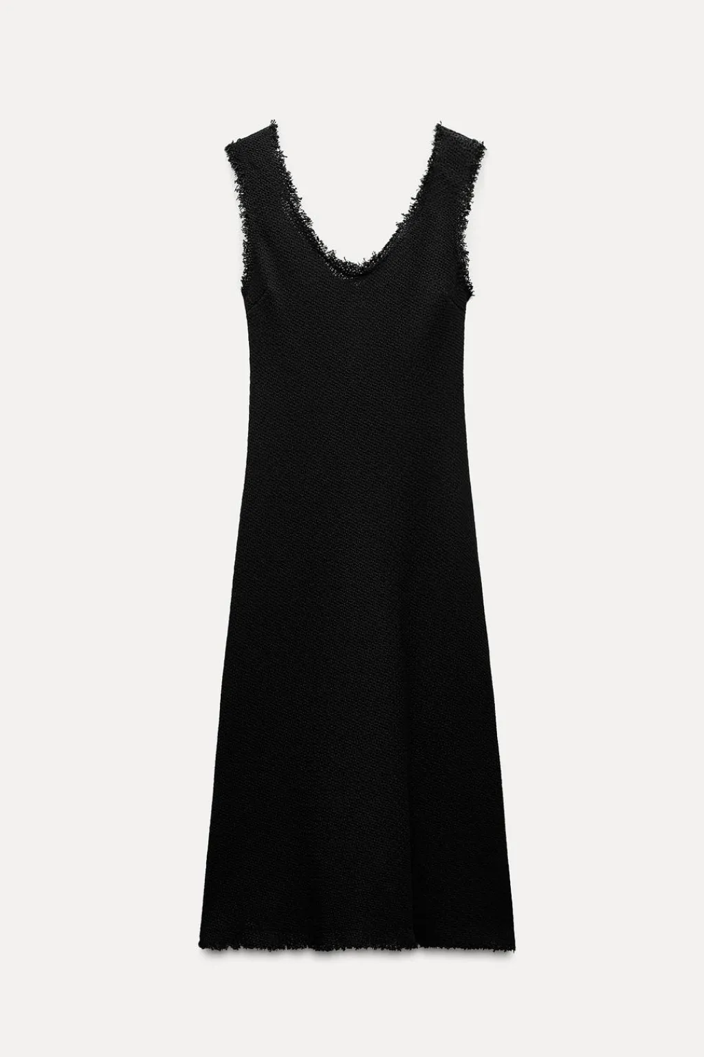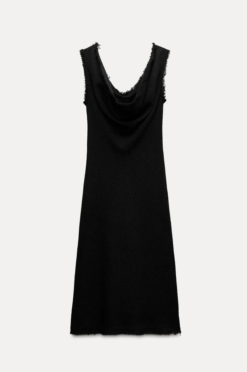 Vestido midi confeccionado en hilatura con mezcla de algodón. Escote fluido drapeado y manga sisa. Acabados desflecados. Forro interior a tono.