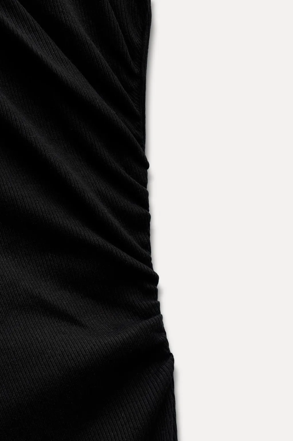 Vestido midi de cuello redondo y manga corta. Detalle de drapeado lateral.