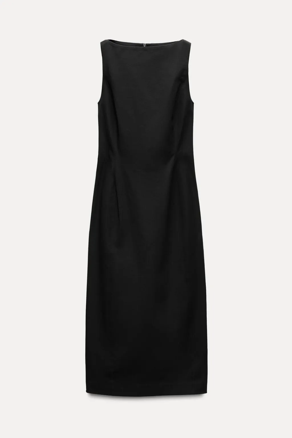 Vestido midi confeccionado en hilatura con algodón. Cuello redondo y manga sisa. Cierre con cremallera oculta en costura.