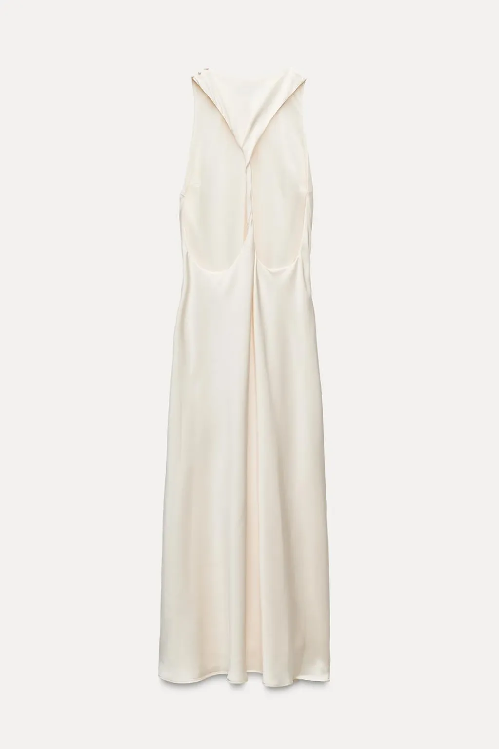 Vestido de cuello redondo con botones forrados a tono en hombro. Detalle de espalda abierta con tirante ancho enroscado.
