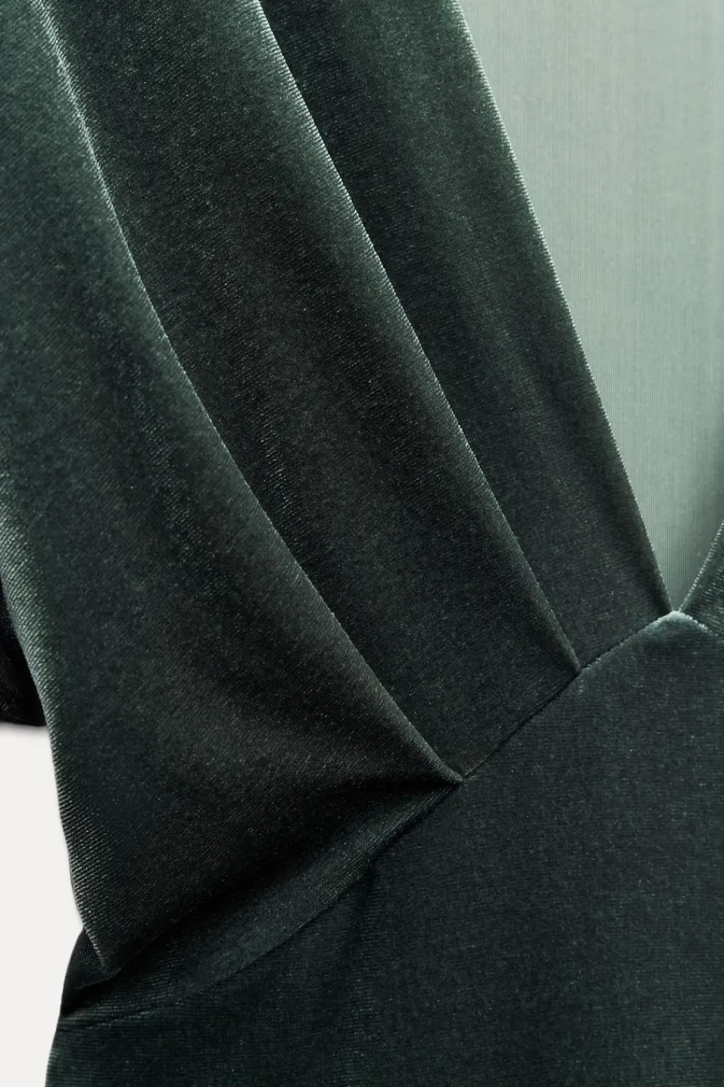 Vestido de escote pico con pliegues y manga corta ancha. Cintura entallada.