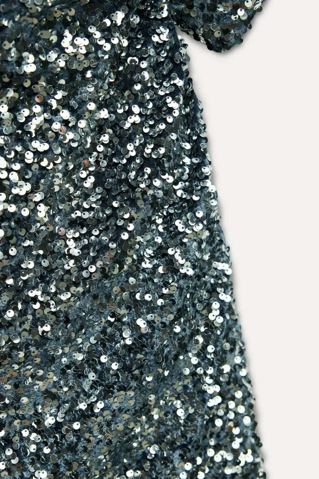 Vestido con lentejuelas de cuello barco y manga asimétrica. Cintura entallada con frunces laterales. Forro interior.