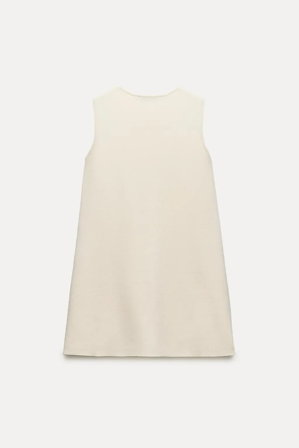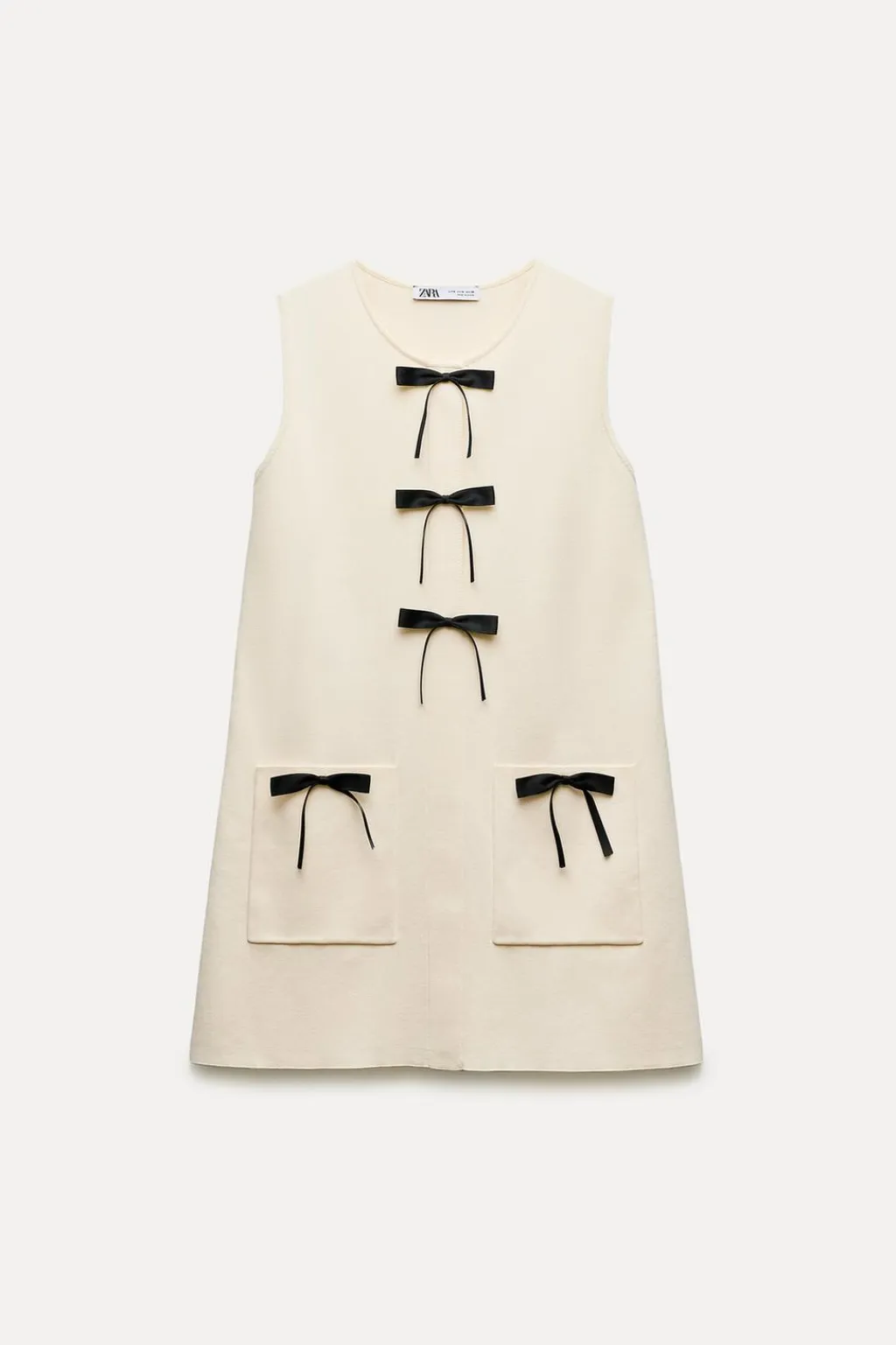 Vestido de cuello redondo y manga sisa. Bolsillos delanteros de plastrón. Detalle de lazos delanteros combinados a contraste.