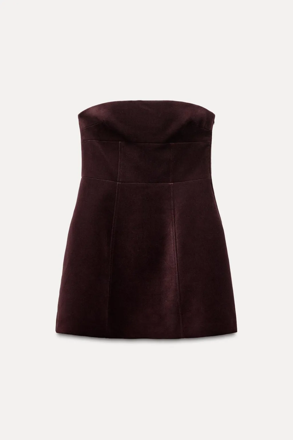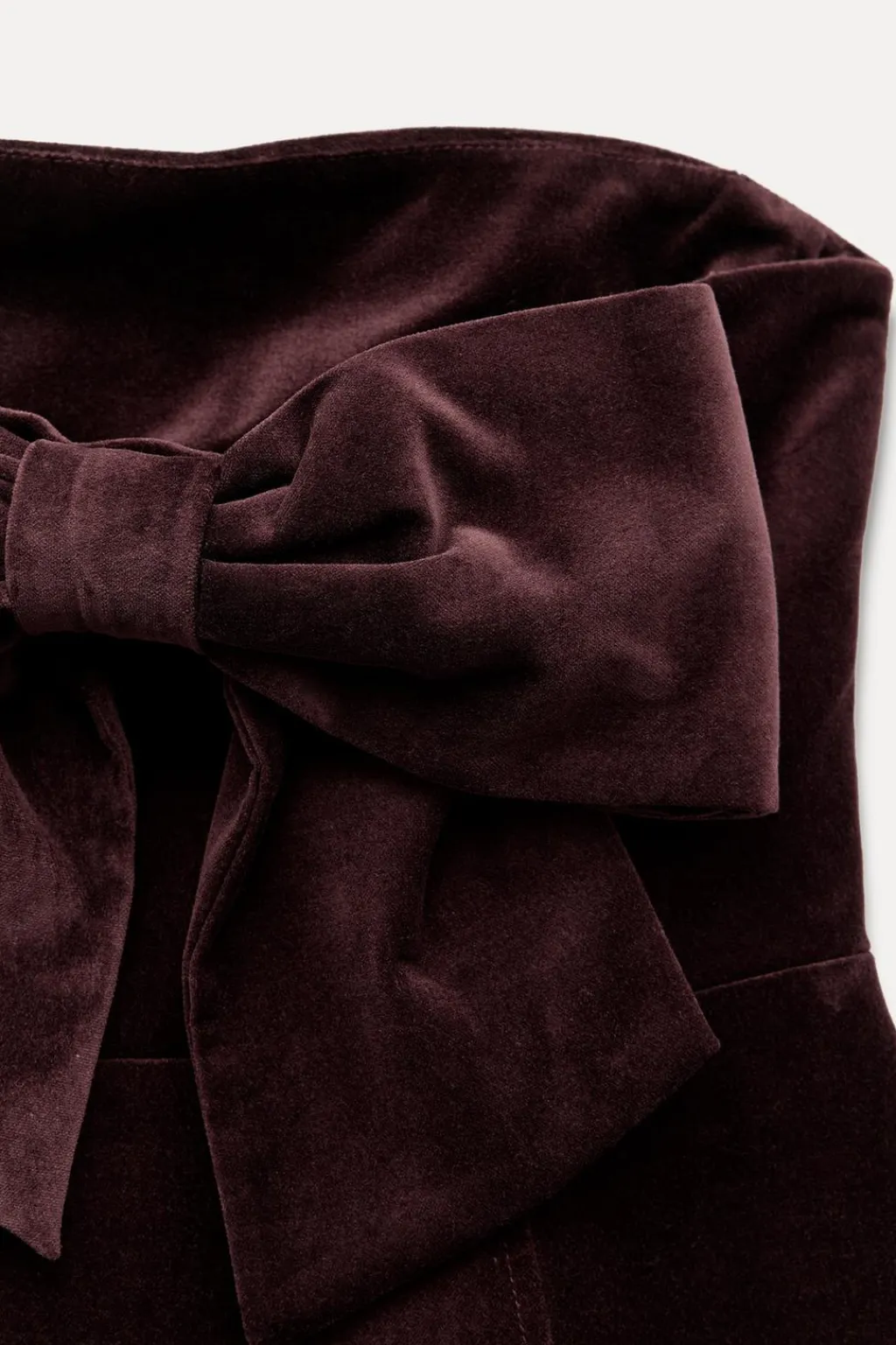 Vestido corto de escote recto y hombros descubiertos. Detalle de lazo en espalda. Forro interior combinado. Cierre lateral con cremallera oculta en costura