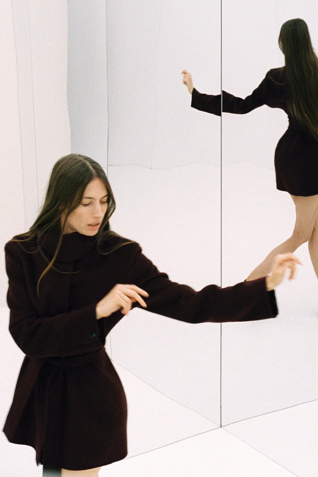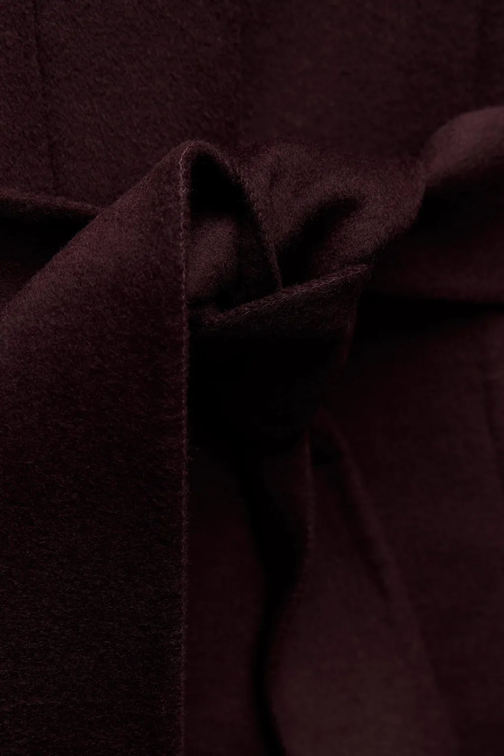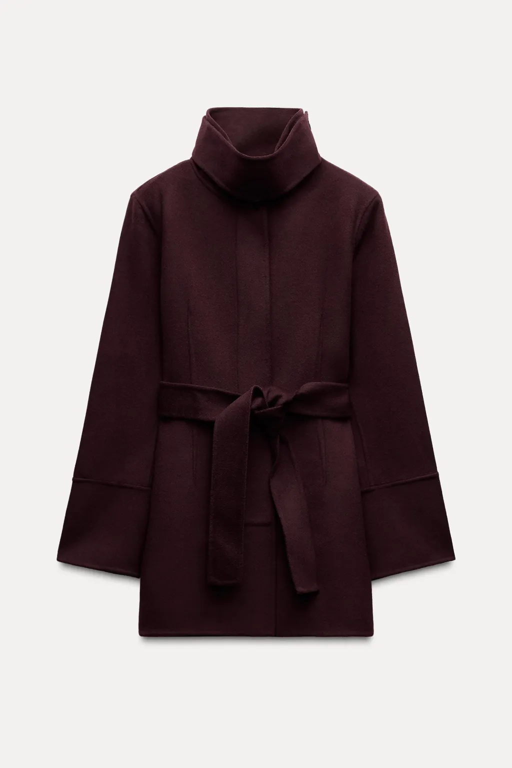 Abrigo confeccionado en hilatura con lana. Cuello alto y manga larga con botón. Bolsillos delanteros. Cinturón en mismo tejido ajustable con lazadas. Cierre frontal con botones ocultos.