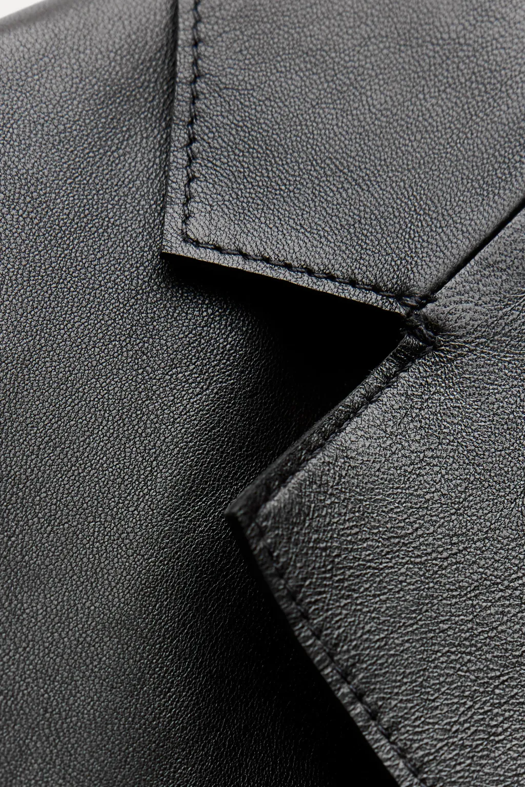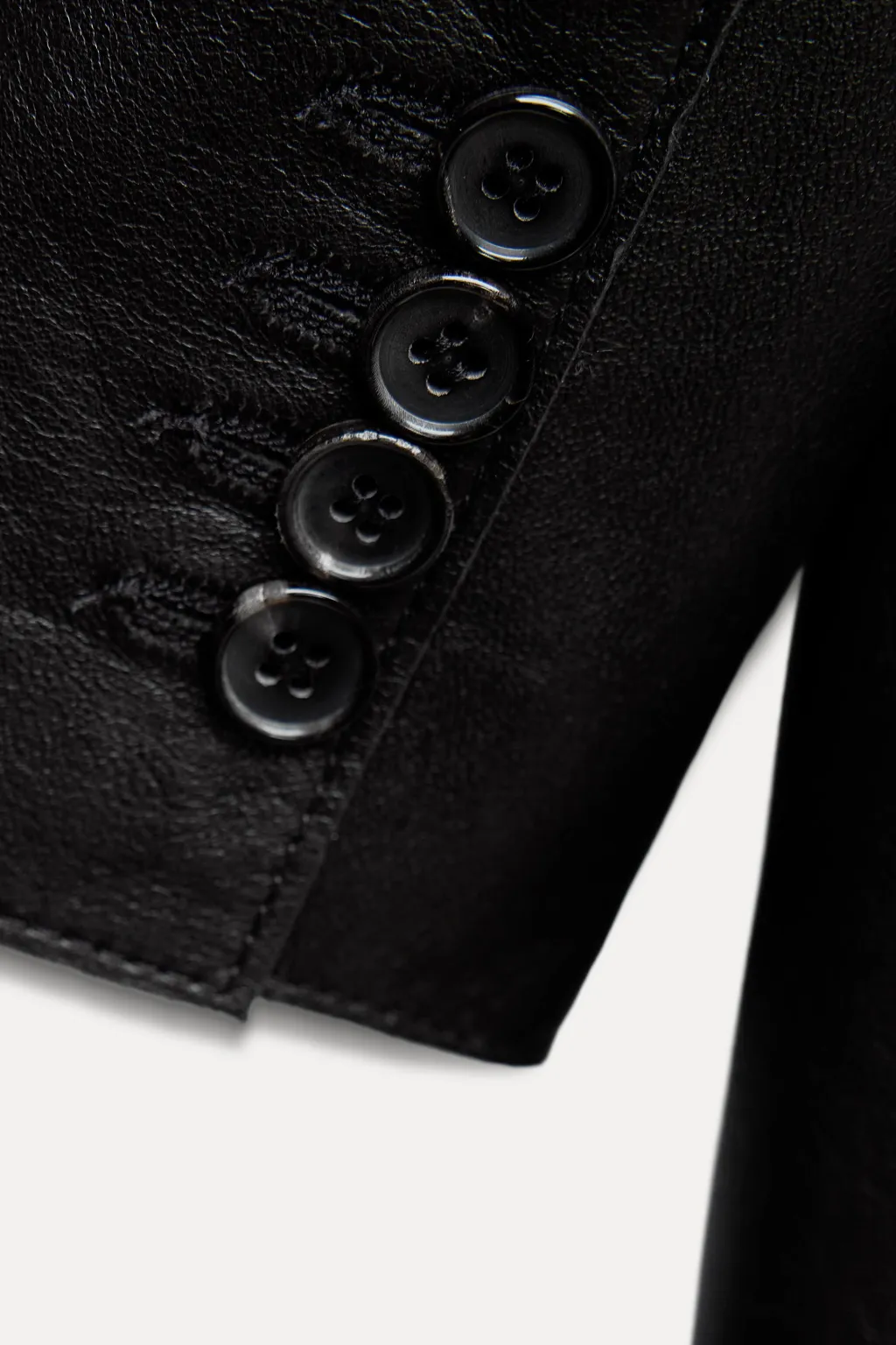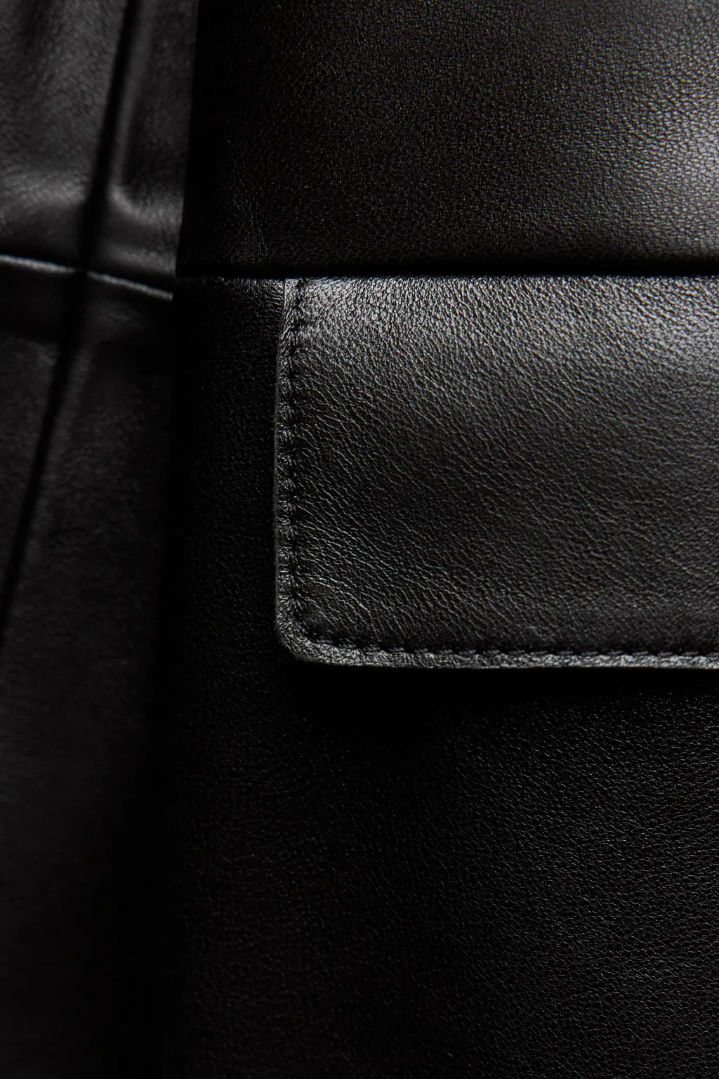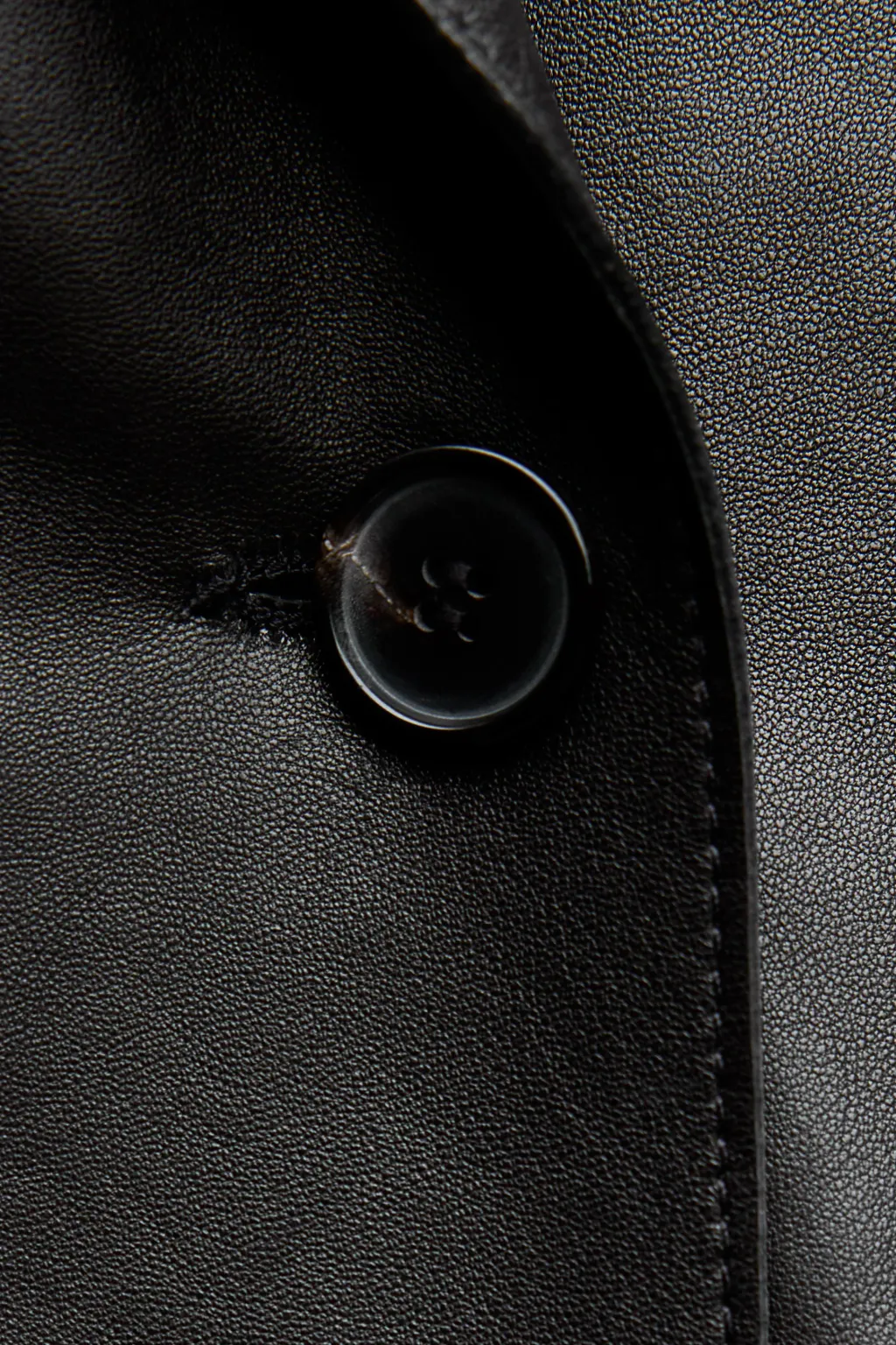 Abrigo largo realizado en piel 100%. Cuello solapa de muescas y manga larga acabada en abertura y botones. Bolsillos con solapa en delantero. Forro interior a tono. Cierre frontal con botones.