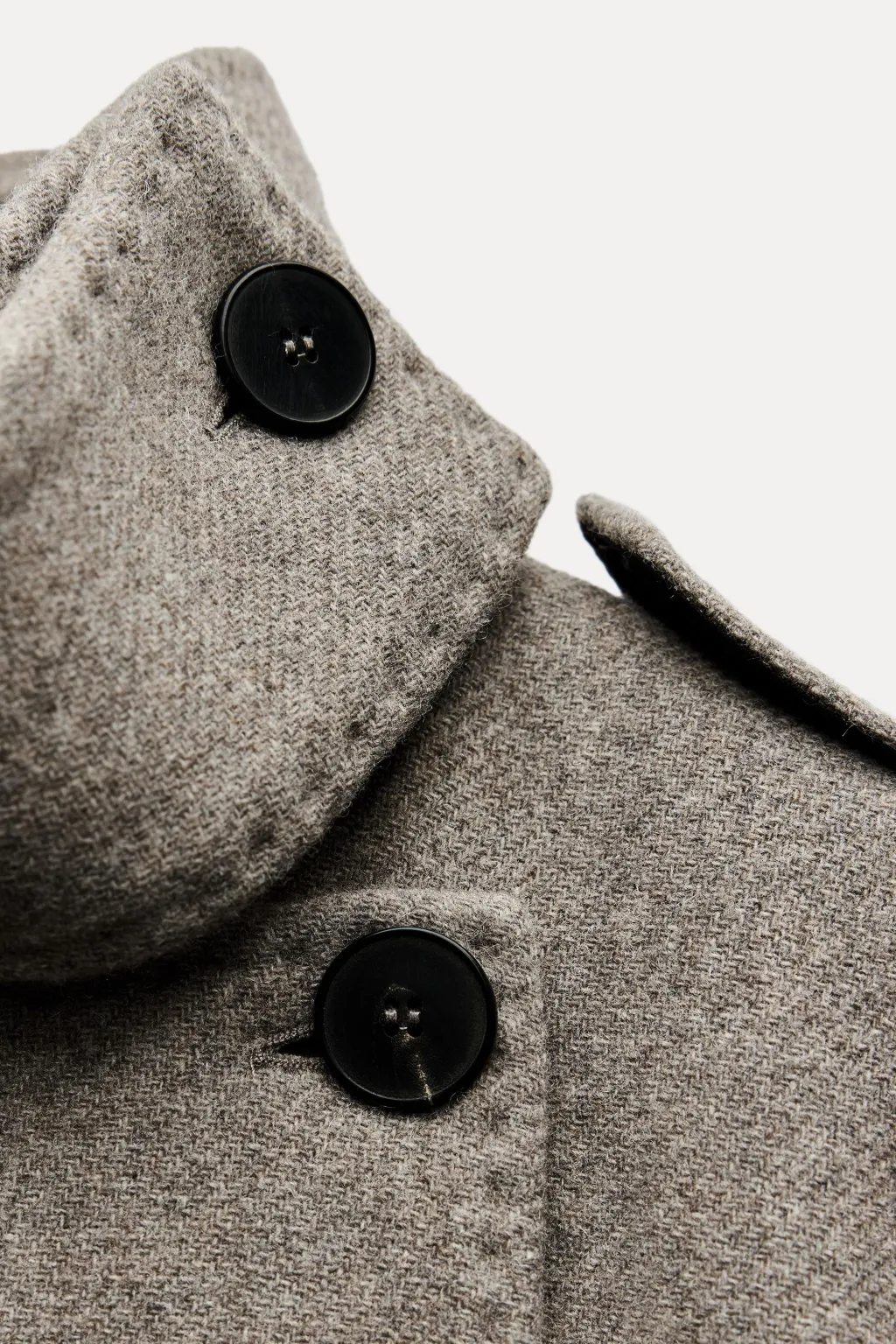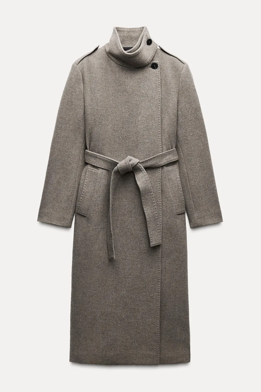 Abrigo largo confeccionado en hilatura con mezcla de lana. Cuello alto y manga larga con trabillas en hombros. Bolsillos en delantero. Cinturón en mismo tejido ajustable con lazadas. Cierre frontal con botones ocultos.