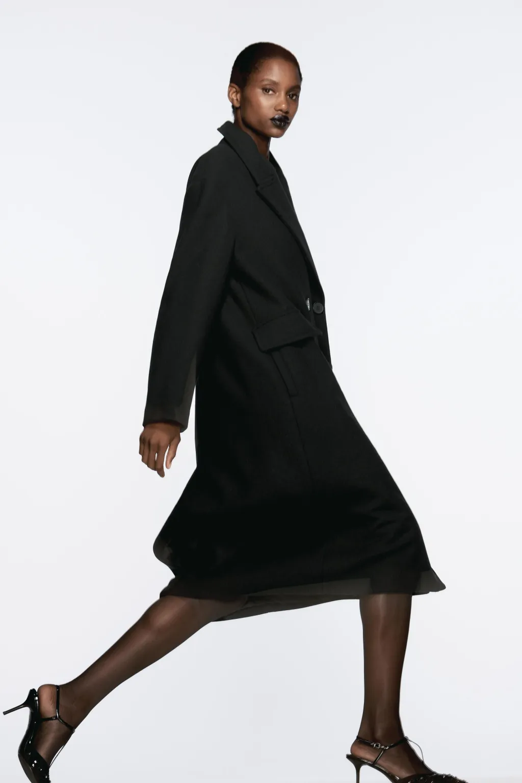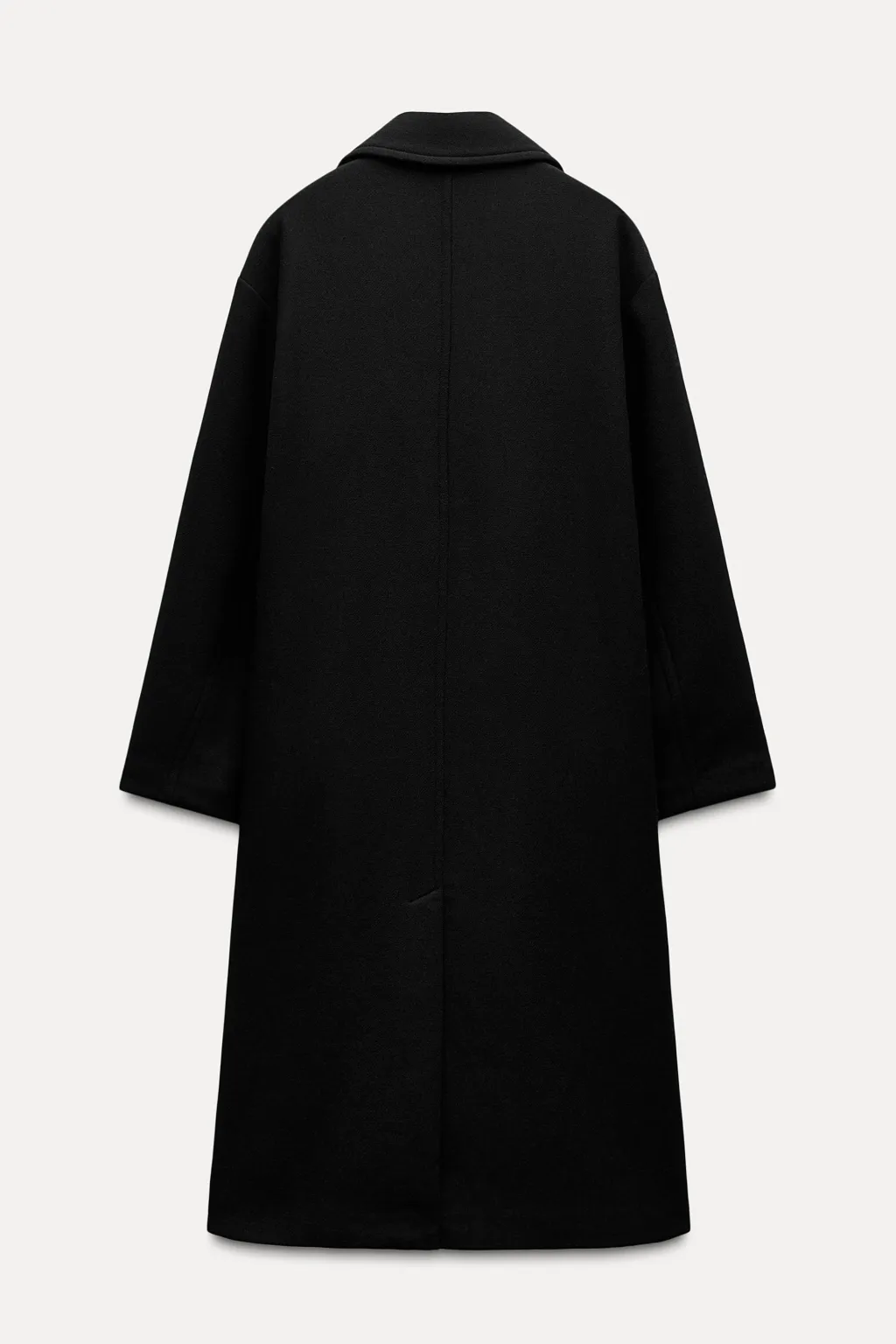 Abrigo amplio confeccionado con lana. Cuello solapa y manga larga. Bolsillos delanteros con solapa. Bajo con abertura en espalda. Cierre frontal cruzado con botones.
