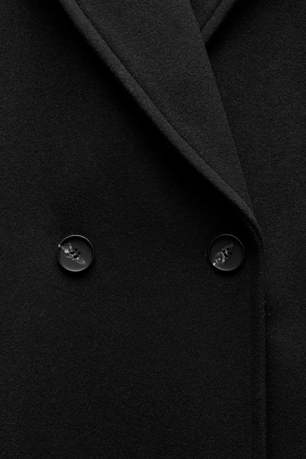 Abrigo amplio de cuello solapa y manga larga acabada con trabilla y botón. Bolsillos delanteros de vivo. Cierre frontal cruzado con botones.
