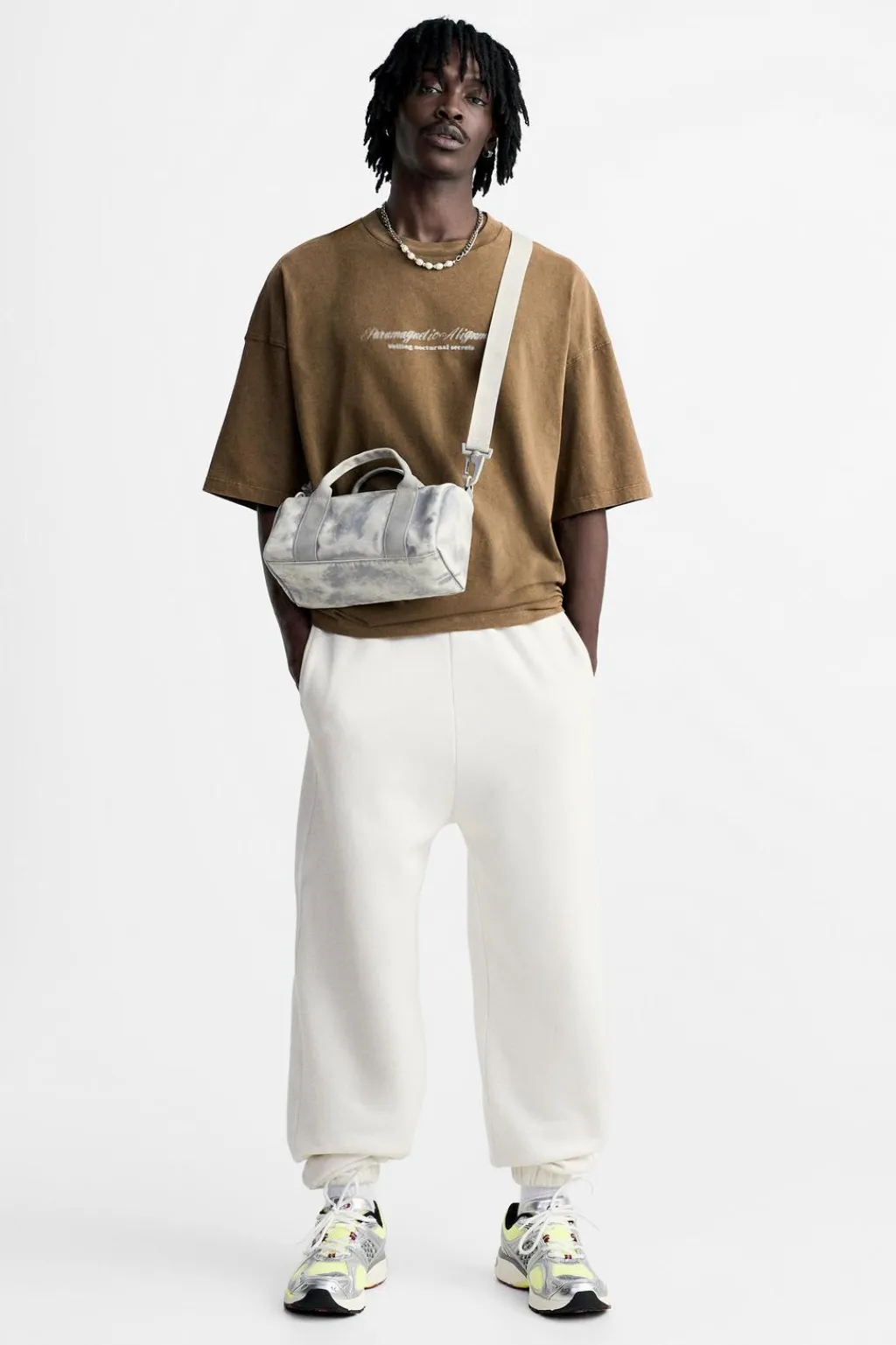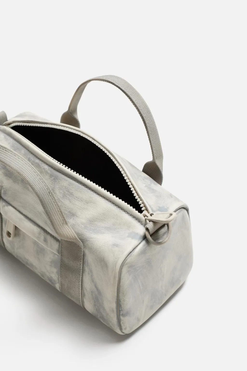 Bolso con dos asas de mano. Compartimento principal con cierre mediante cremallera. Bolsillo en la parte frontal. Asa bandolera ajustable y extraíble. Acabado desgastado.
