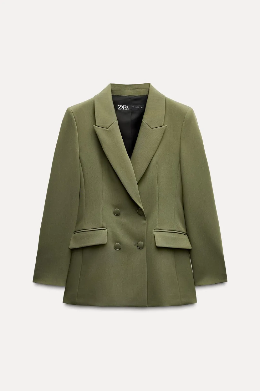 Blazer de cuello solapa y manga larga con hombreras. Bolsillos delanteros con solapa. Forro interior. Cierre frontal cruzado con botones.