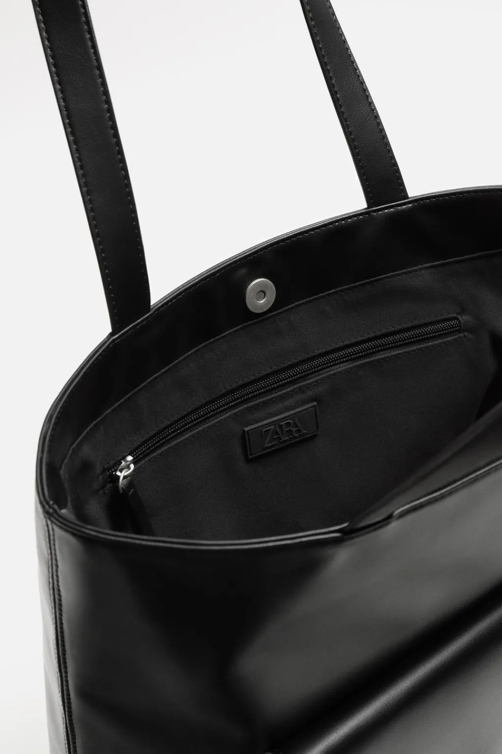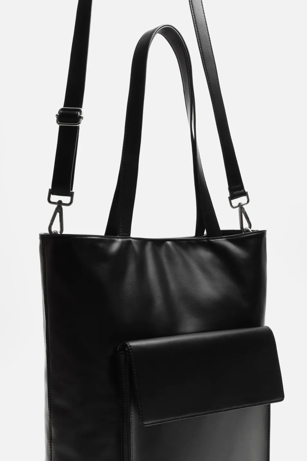 Bolso tipo shopper. Compartimento principal con cierre mediante botón a presión. En su interior cuenta con un bolsillo con cierre de cremallera. En la parte frontal tiene un bolsillo de tamaño grande con cierre de solapa. Dispone de dos asas de mano y un asa de hombro extraíble y ajustable.