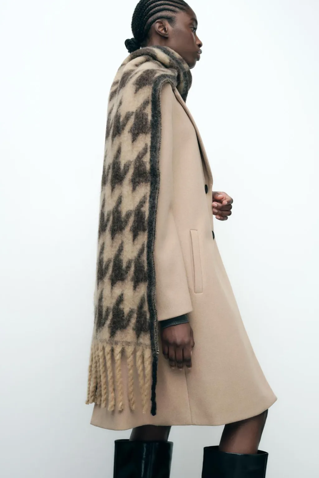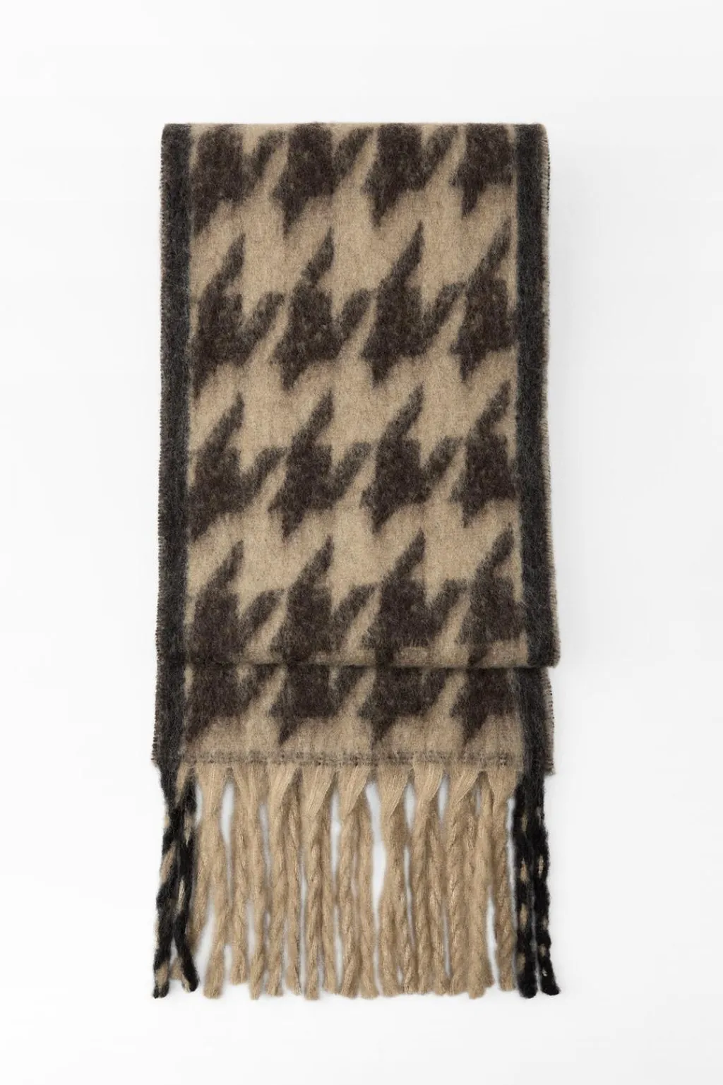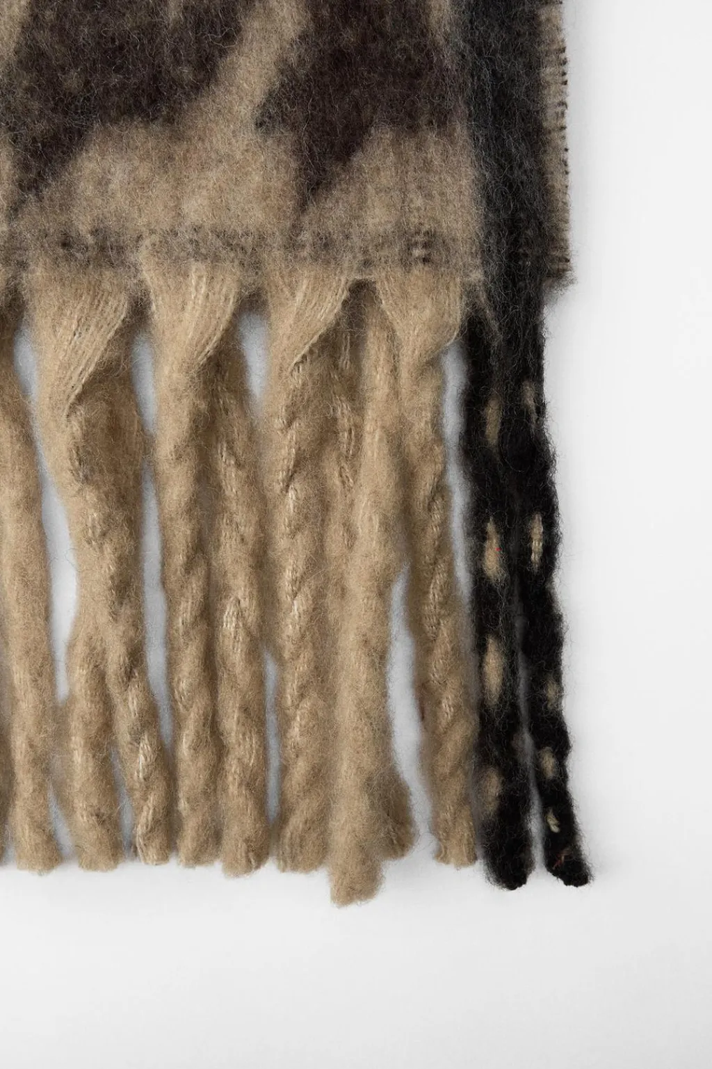 Bufanda estampada confeccionada en mezcla de tejido y lana 26%. Detalle de banda lateral combinada a contraste. Acabados en flecos.