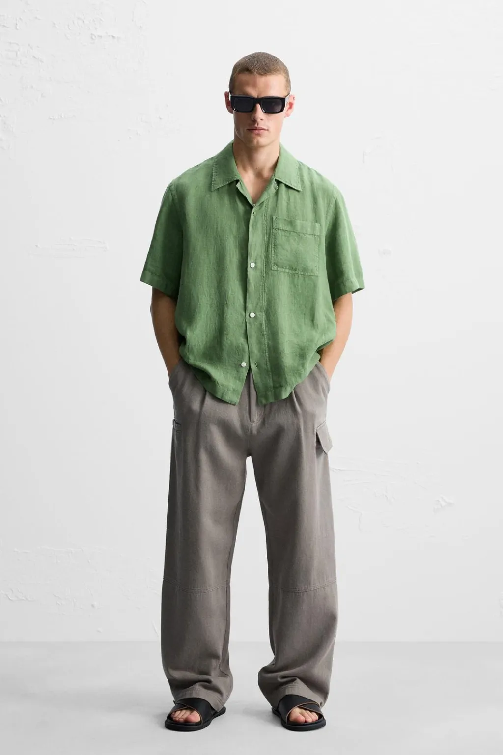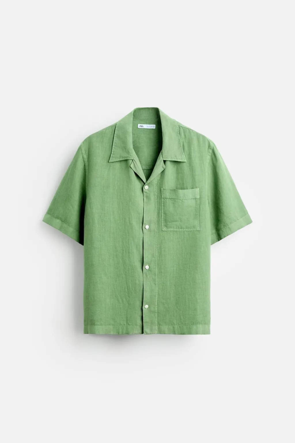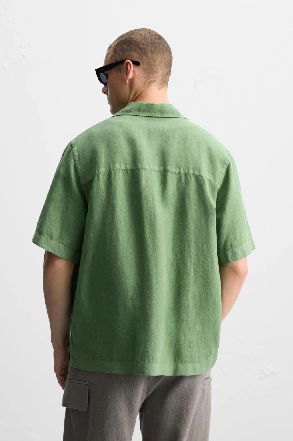 Camisa relaxed fit confeccionada en tejido de lino. Cuello bowling y manga corta. Bajo con aberturas laterales. Cierre frontal de botonadura.
