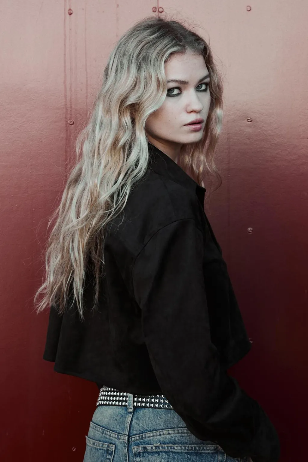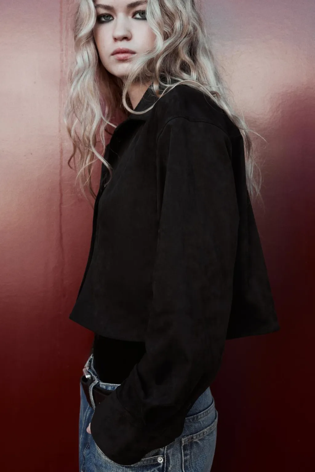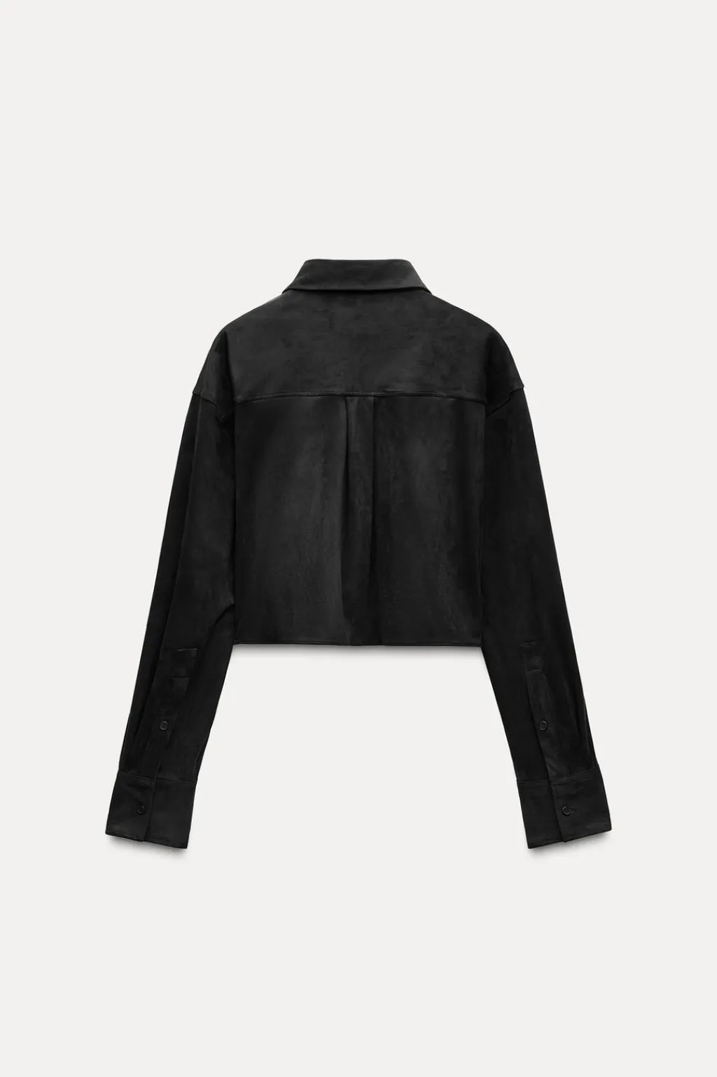 Camisa crop de cuello solapa y manga larga acabada en puño. Detalle de pinza en espalda. Cierre frontal con botones ocultos por sopata.