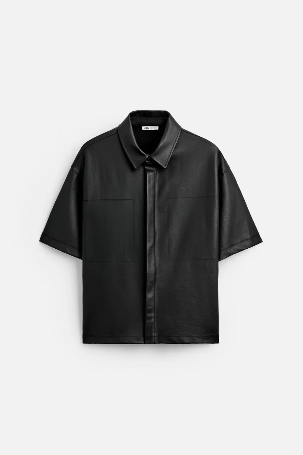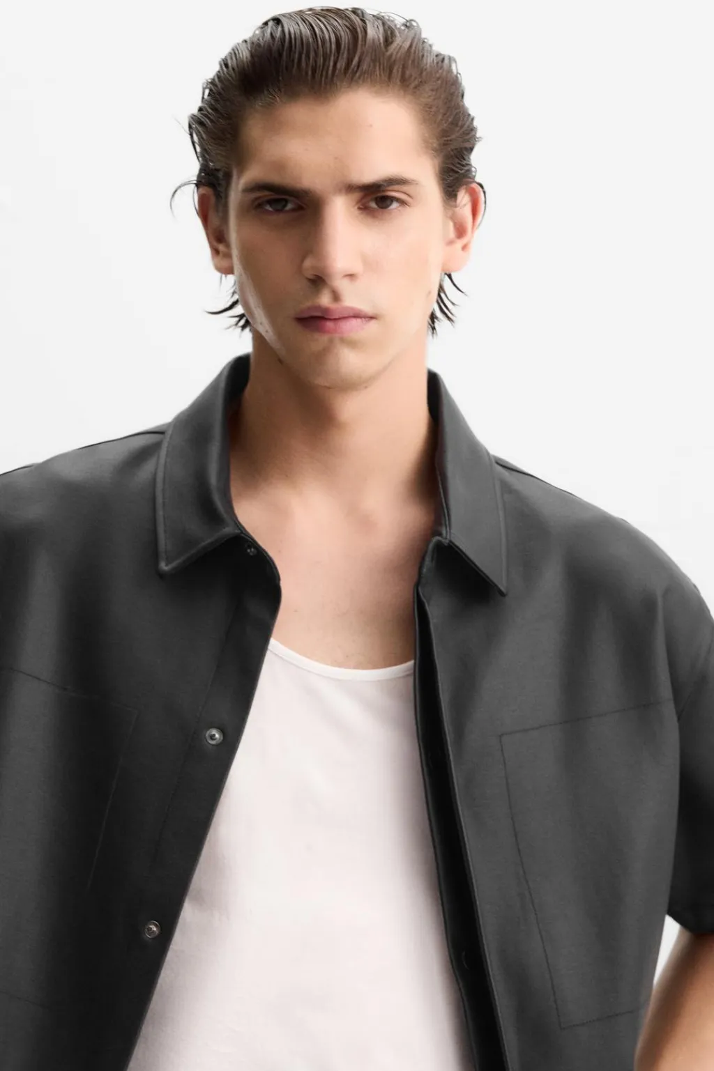 Camisa cropped fit. Cuello solapa y manga corta. Cierre frontal de botonadura oculta por solapa.