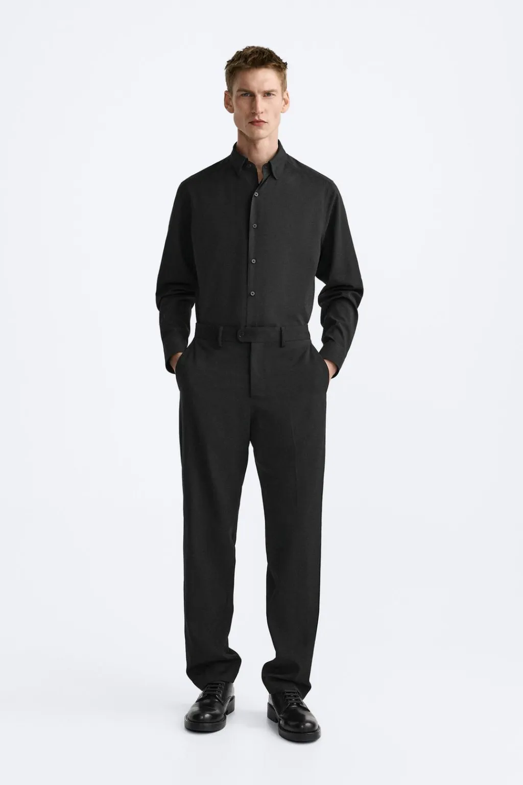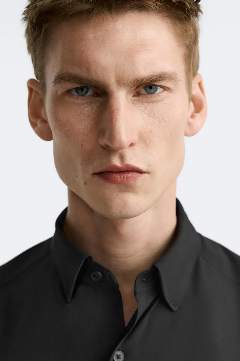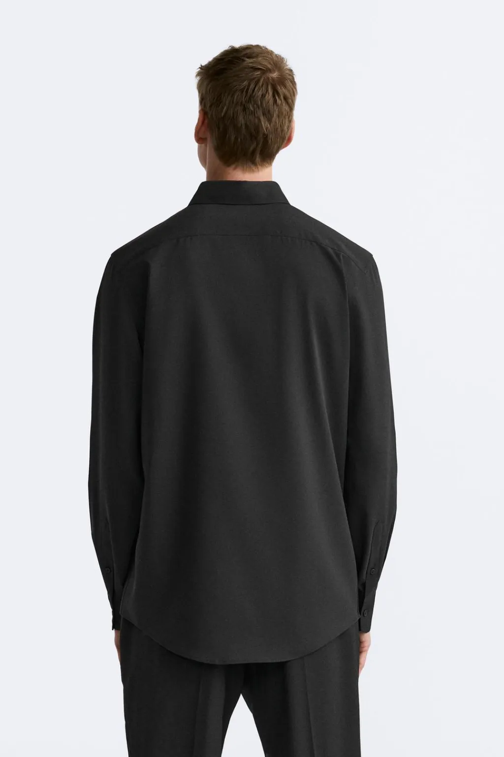 Camisa slim fit confeccionada en un tejido que minimiza la necesidad de plancha después del lavado. Cuello italiano y manga larga acabada en puño con botón. Cierre frontal de botonadura.