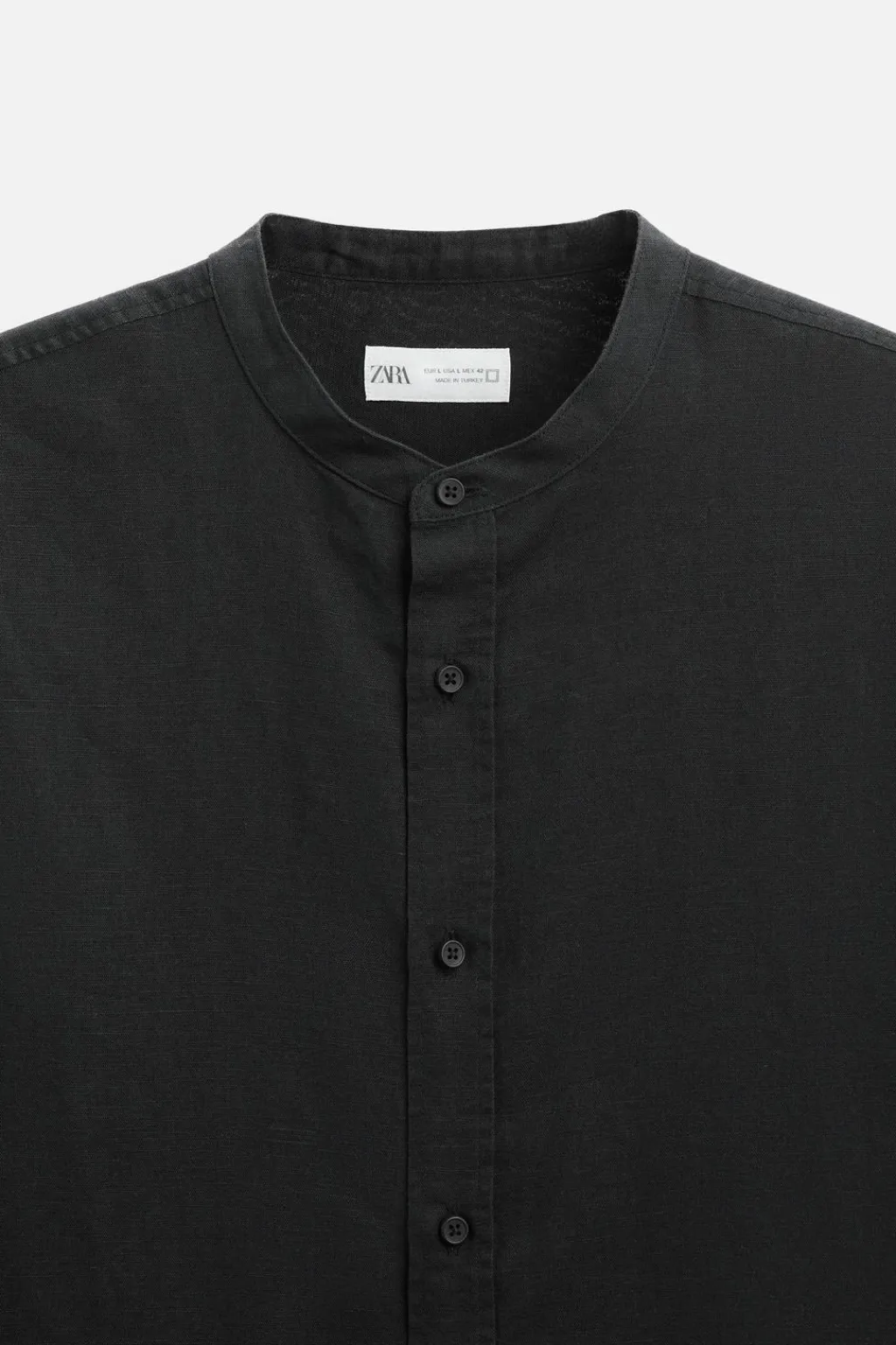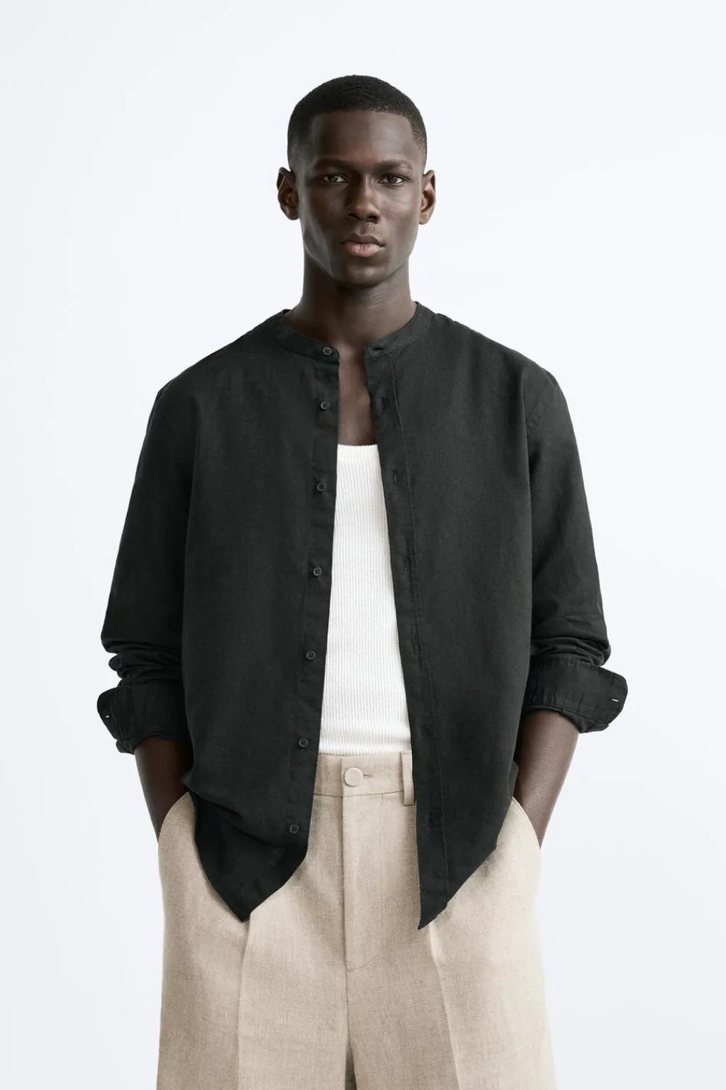 Camisa relaxed fit confeccionada en tejido con lino y algodón. Cuello tira y manga larga acaba en puño con botón. Cierre frontal de botonadura.