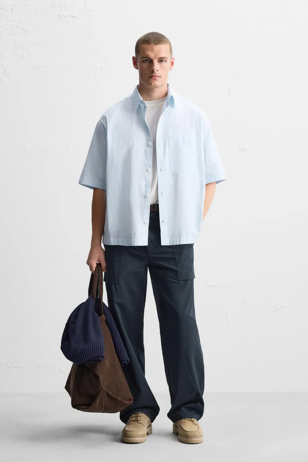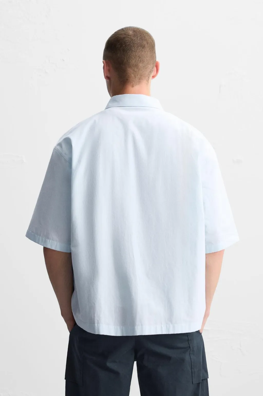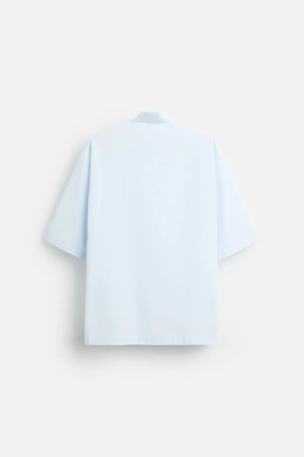 Camisa relaxed fit confeccionada en popelín de algodón con tacto aterciopelado. Cuello solapa y manga corta. Bolsillo de plastrón en pecho. Cierre frontal de botonadura.
