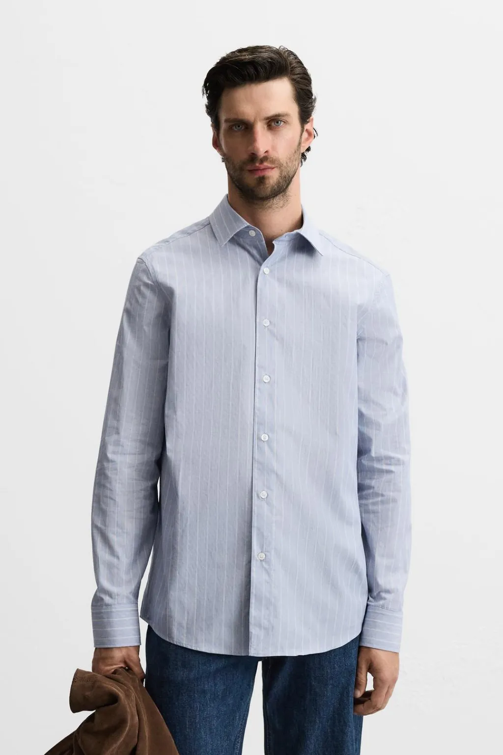 Camisa regular fit confeccionada en tejido de algodón. Cuello solapa y manga larga acabada en puño con botón. Cierre frontal de botonadura.