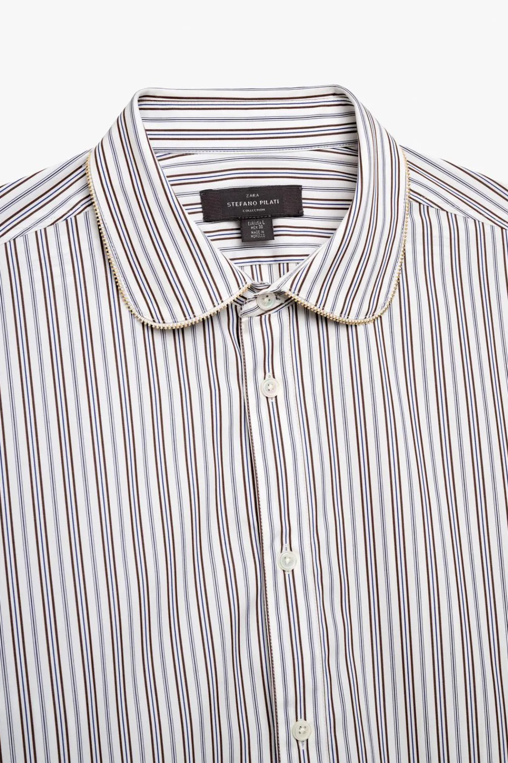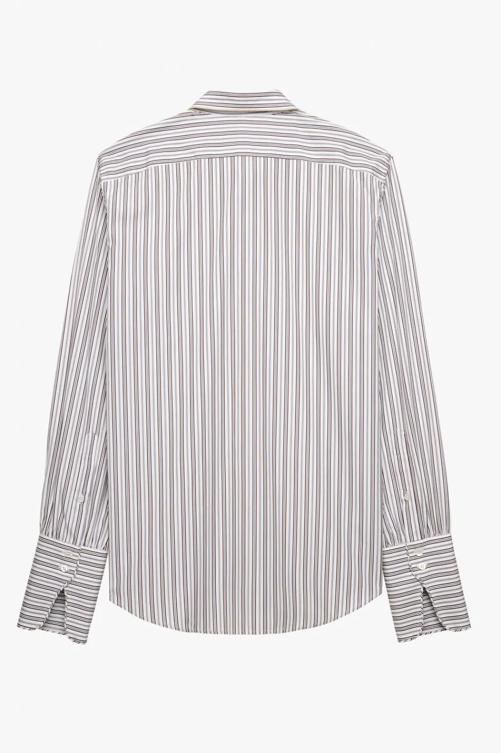 Camisa regular fit confeccionada en tejido de algodón con origen italiano. Cuello bobo acabado con detalle de cremallera metálica. Manga larga acabada en puño doble con detalle de vivo del mismo tejido al biés. Cierre frontal de botonadura