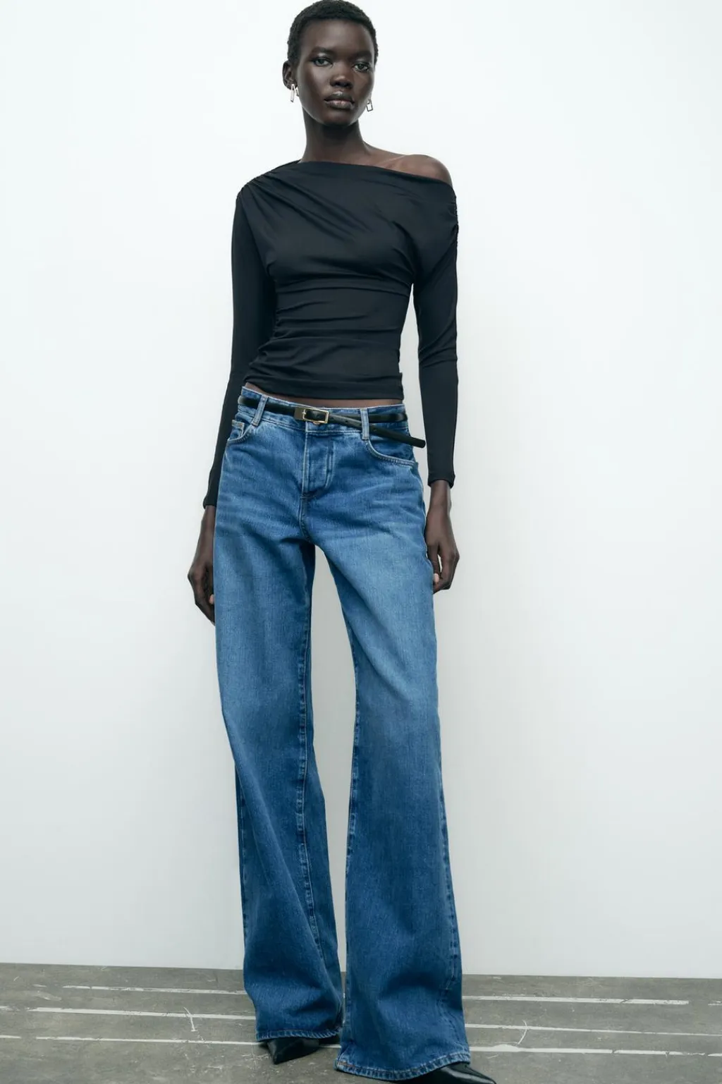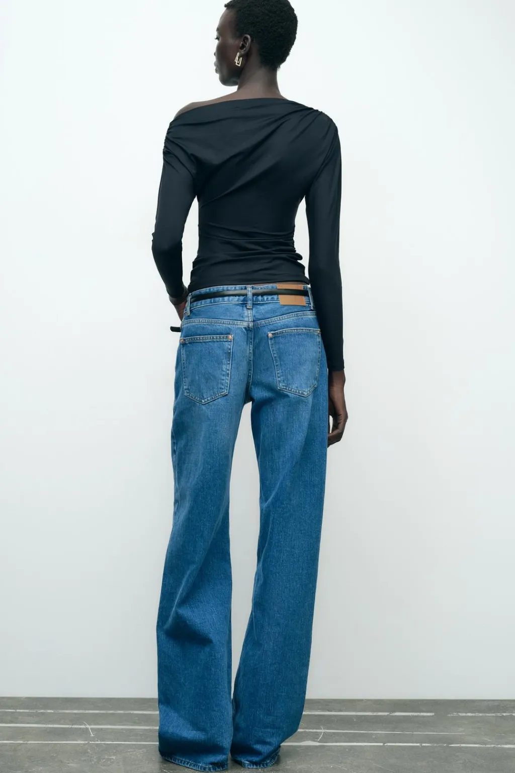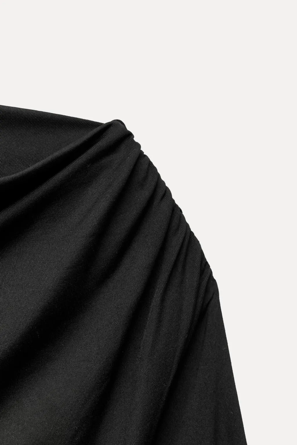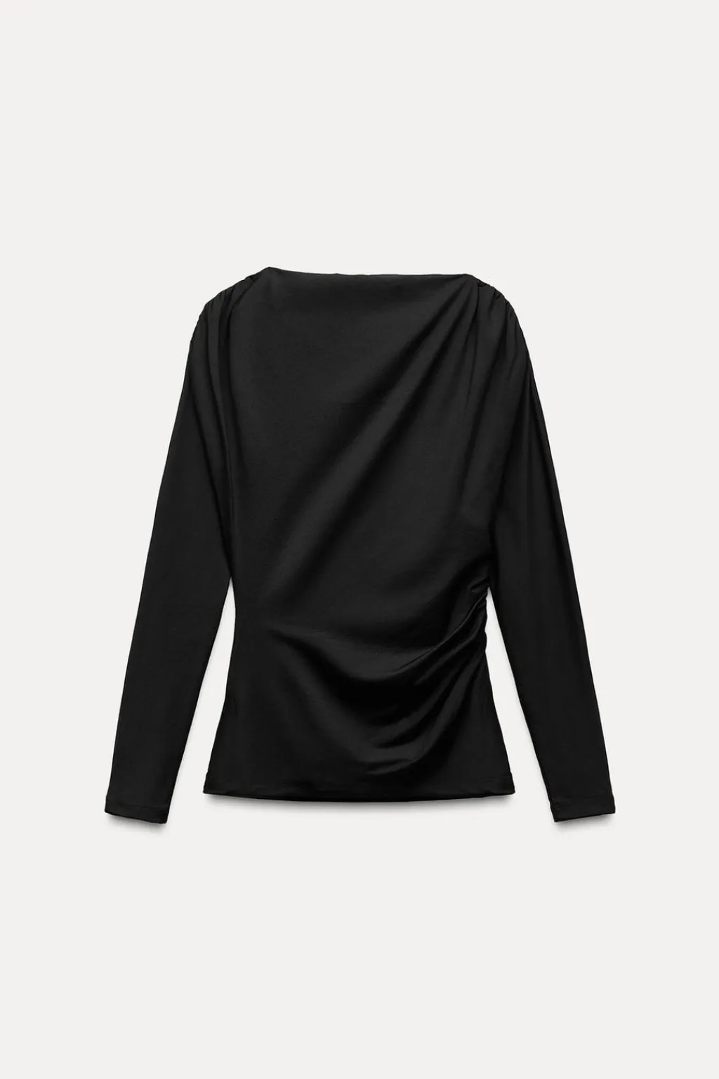 Camiseta de escote asimétrico y manga larga. Detalle de tejido drapeado.