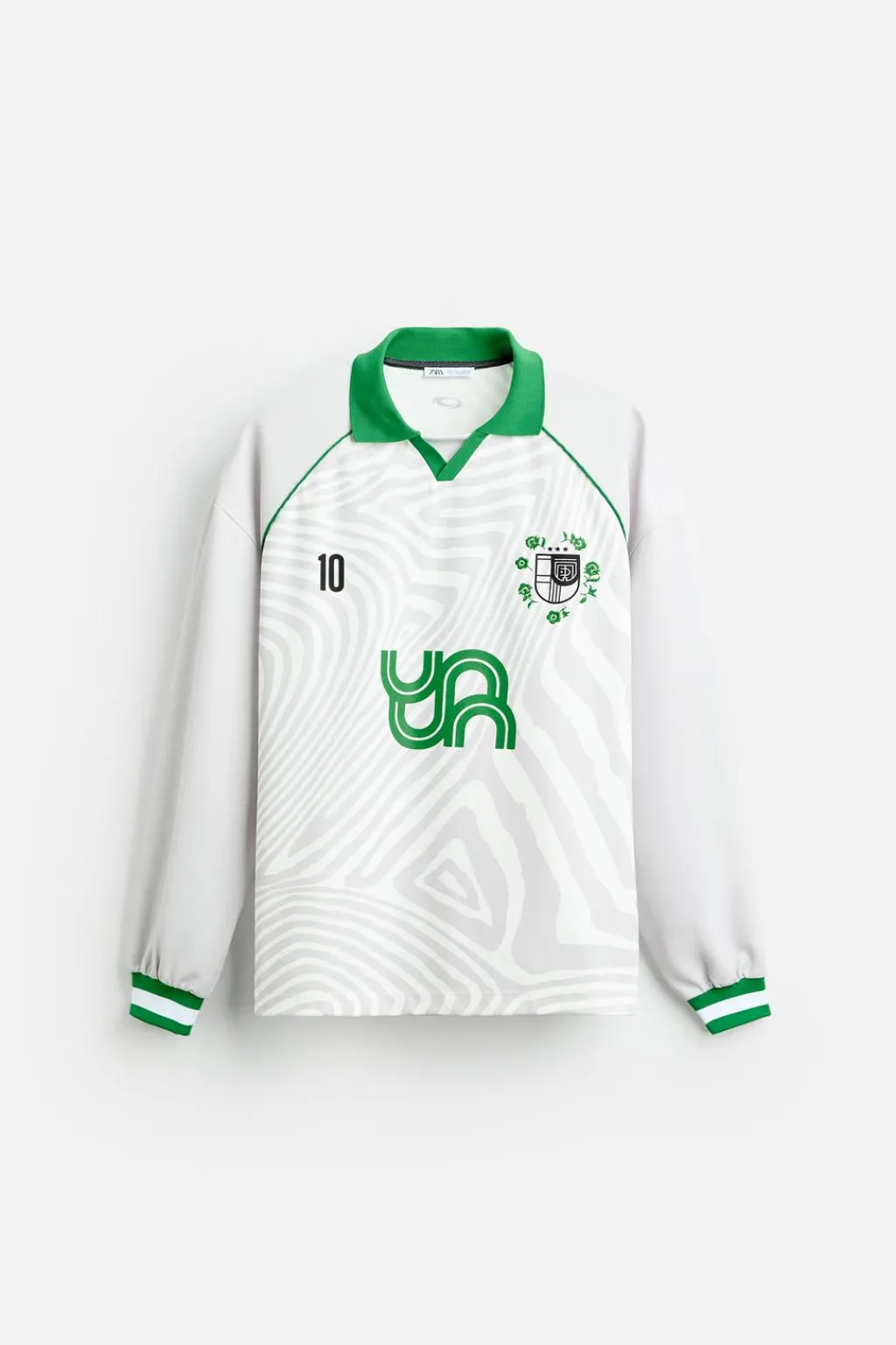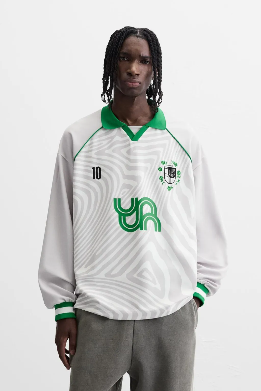 Camiseta relaxed fit. Cuello solapa con abertura frontal y manga larga acabada en puño de rib. Estampados combinados a contraste en delantero y espalda.