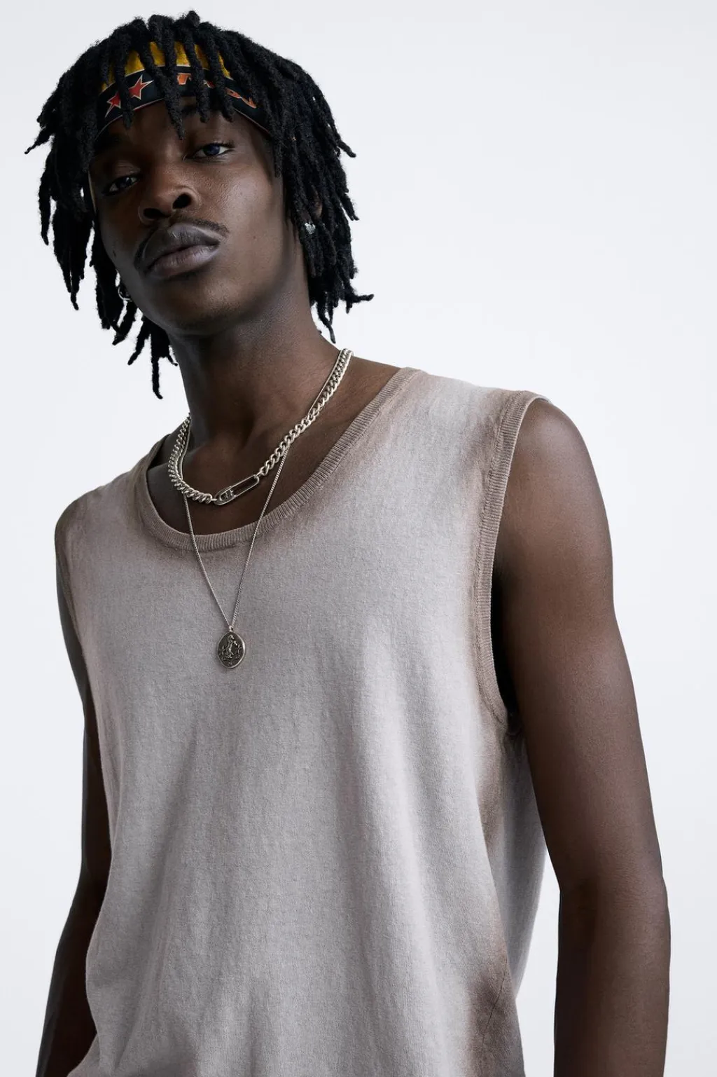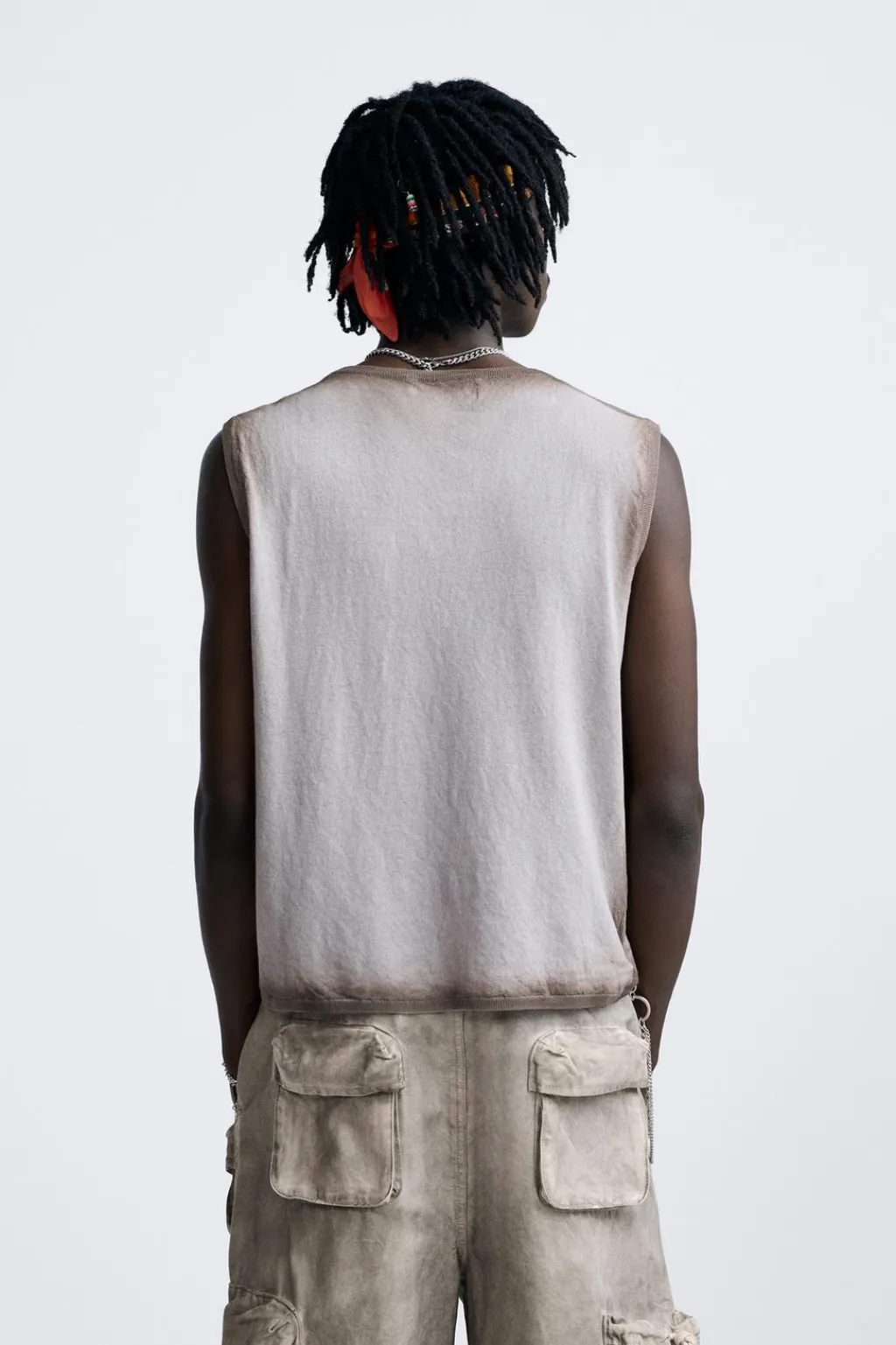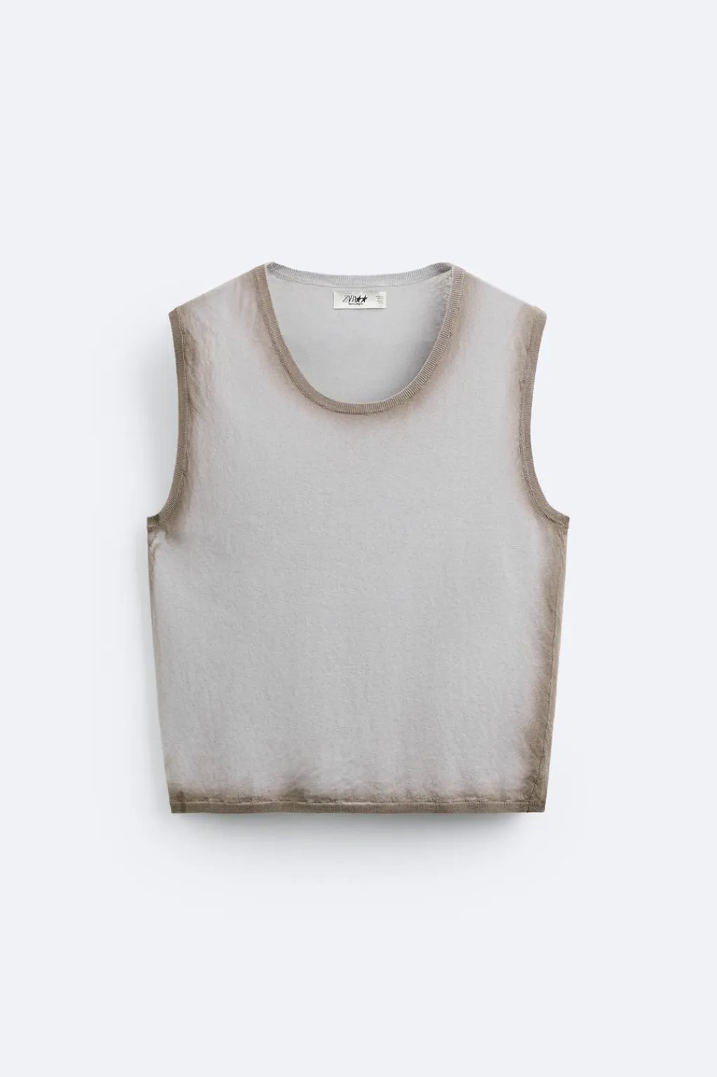 Camiseta de punto con estampado efecto spray. Cuello redondo y manga sisa. Acabados en rib combinado a contraste.