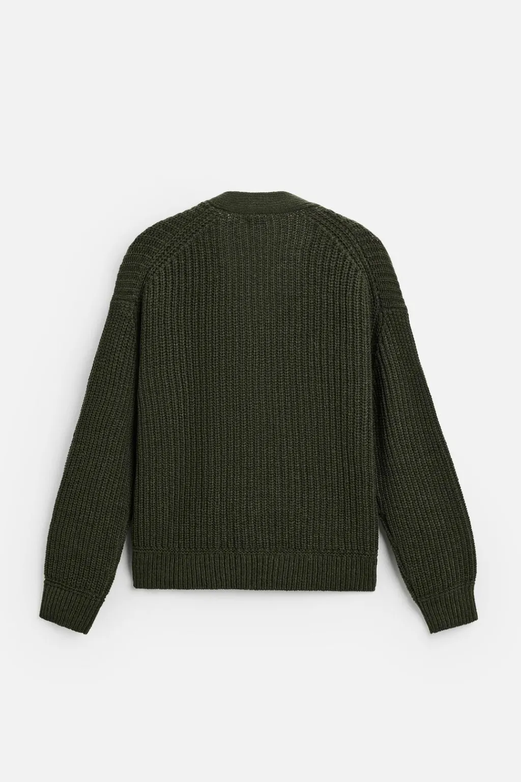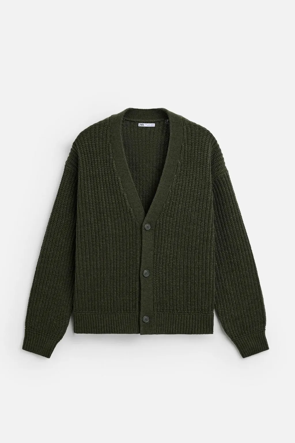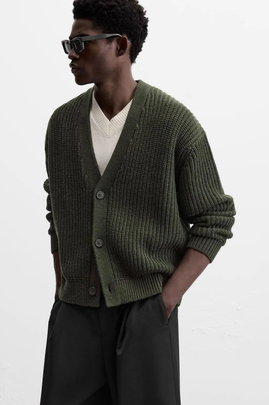 Cárdigan relaxed fit tejido en hilatura con estructura. Cuello pico y manga larga. Acabados en rib. Cierre frontal de botonadura.
