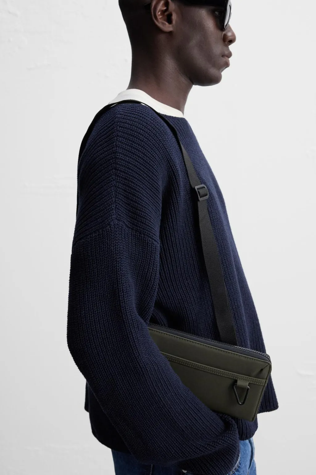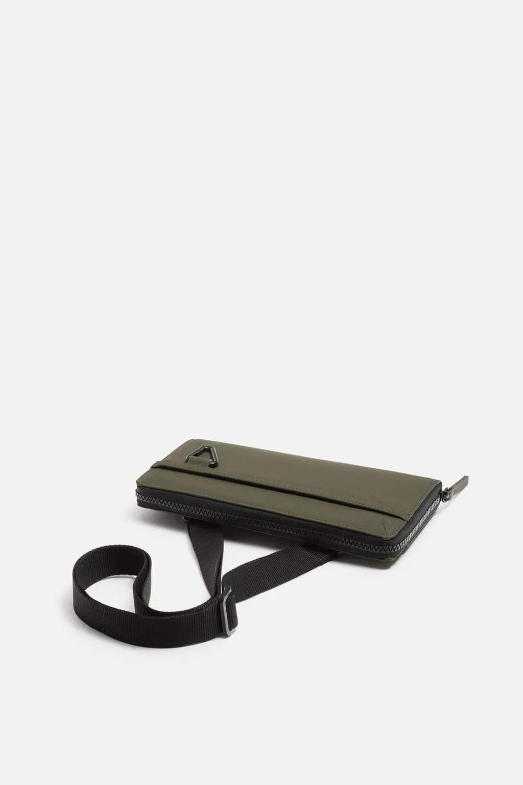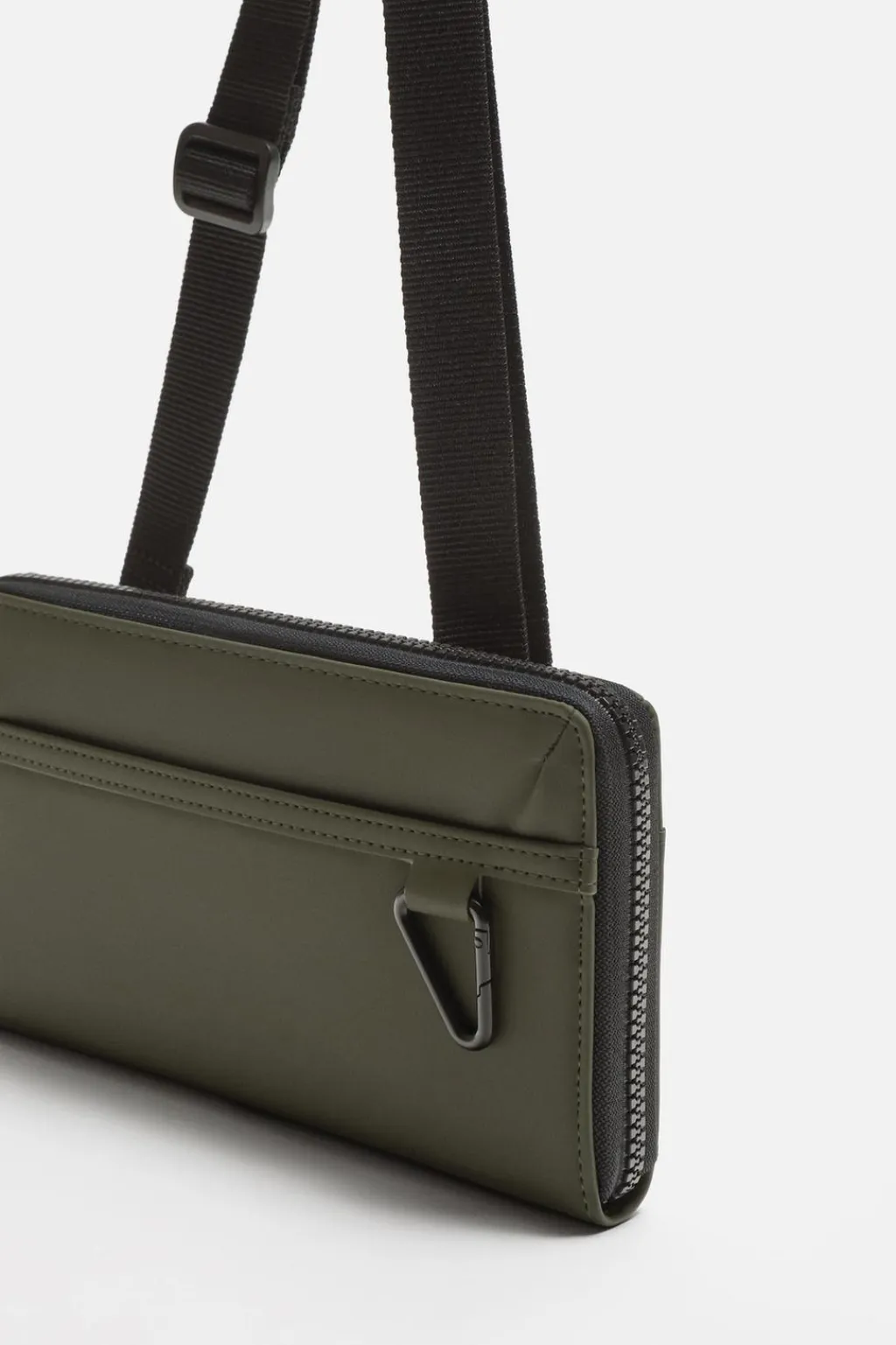 Cartera tipo bandolera. Parte exterior con acabado engomado. Compartimento principal con cierre mediante cremallera, doble fuelle para mayor capacidad, monedero y múltiples posiciones para tarjetas. Bolsillo plano en la parte frontal y trasera. Detalle de gancho metálico en la parte frontal. Asa de hombro ajustable y removible.