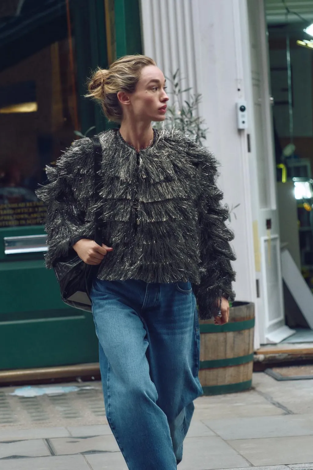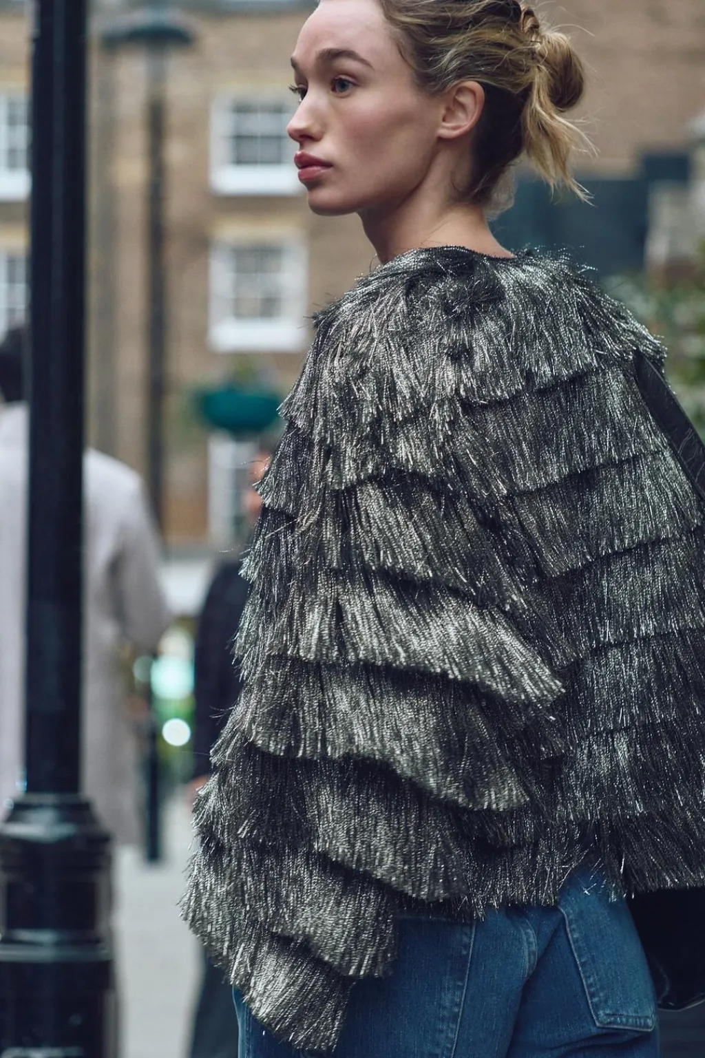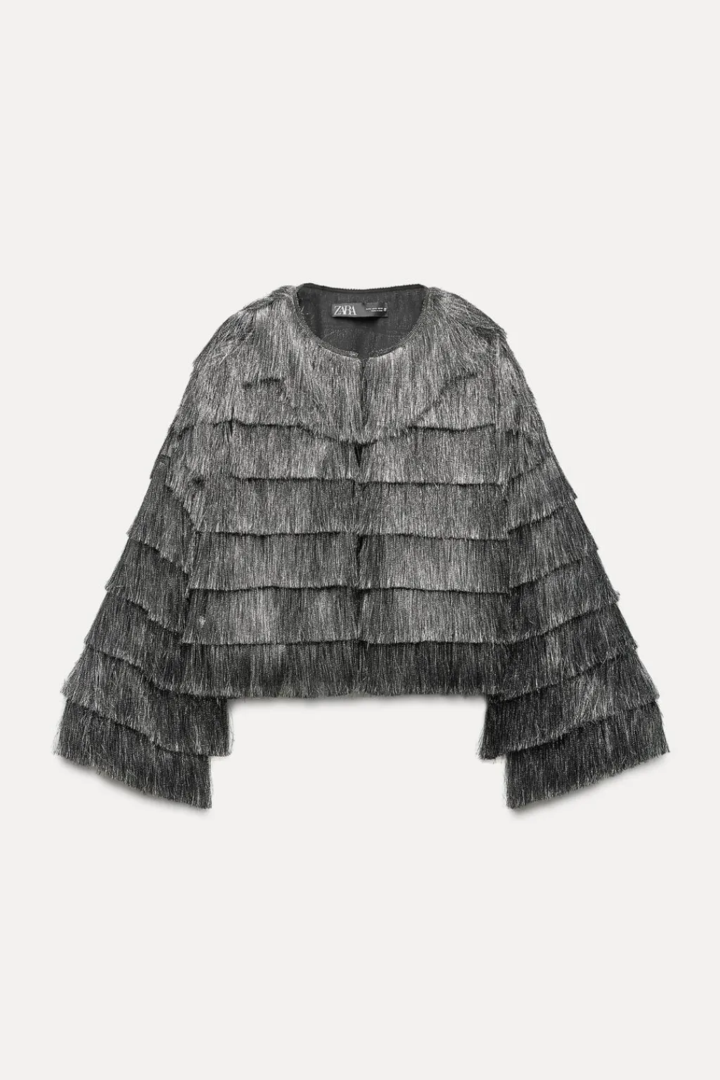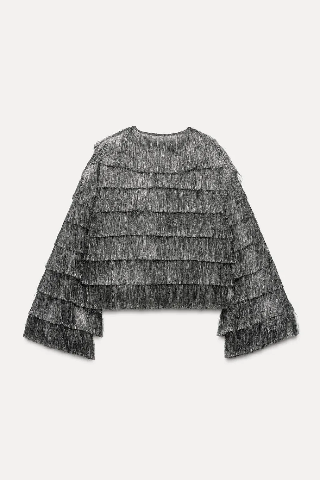 Cazadora de cuello redondo y manga larga. Detalle de flecos con hilo metalizado. Cierre frontal con corchetes ocultos.