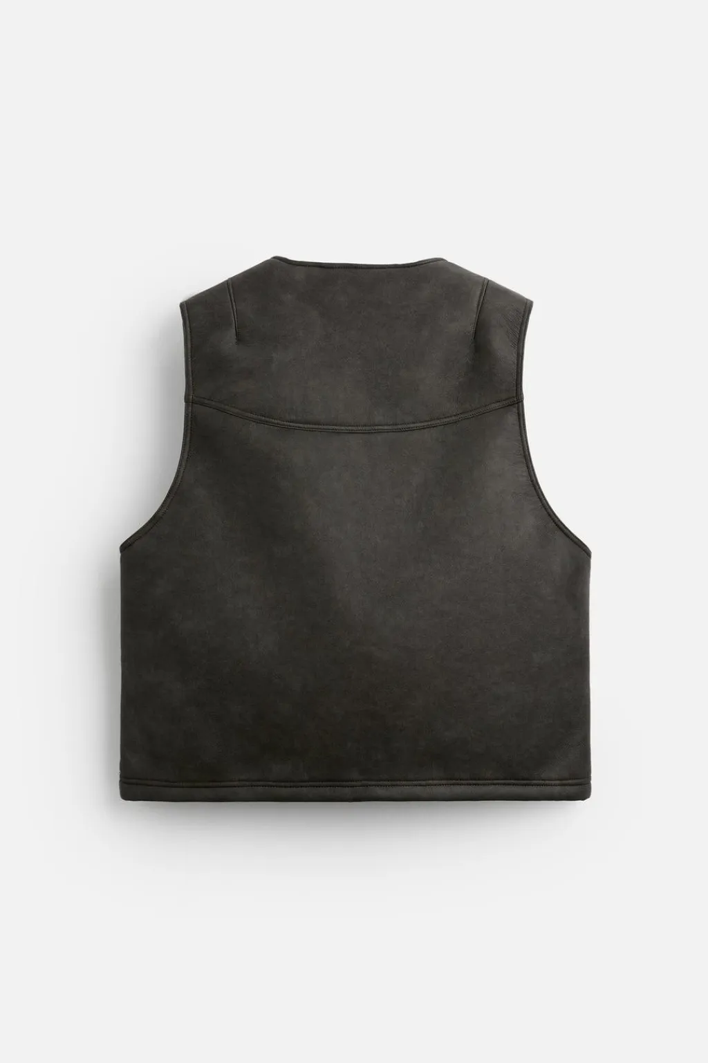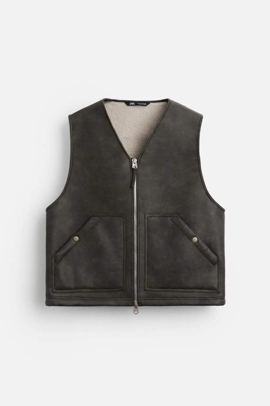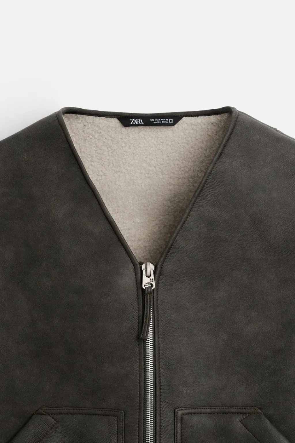 Chaleco relaxed fit confeccionada en tejido efecto piel con el interior de borreguillo combinado a contraste. Cuello pico y manga sisa. Bolsillos plastrón en cadera. Cierre frontal con cremallera.