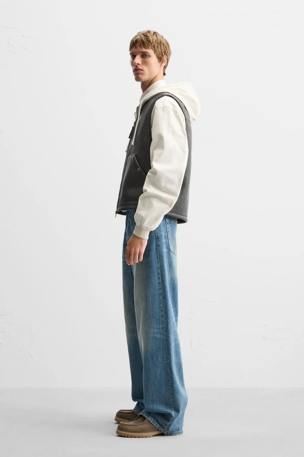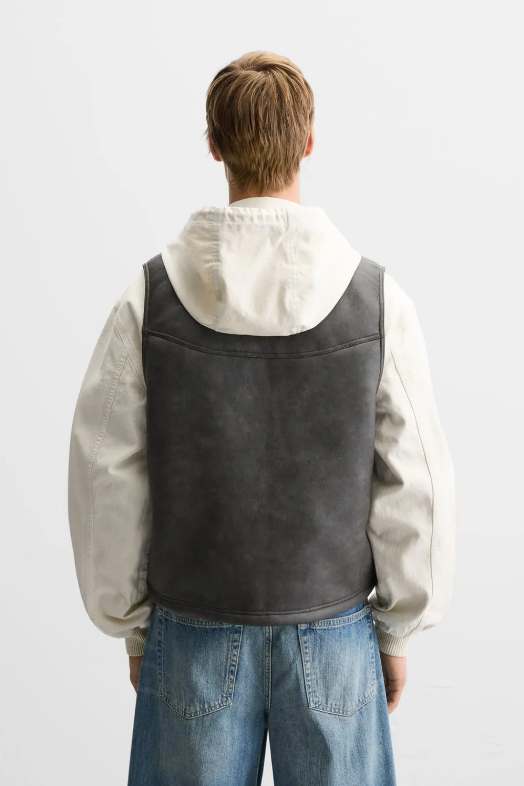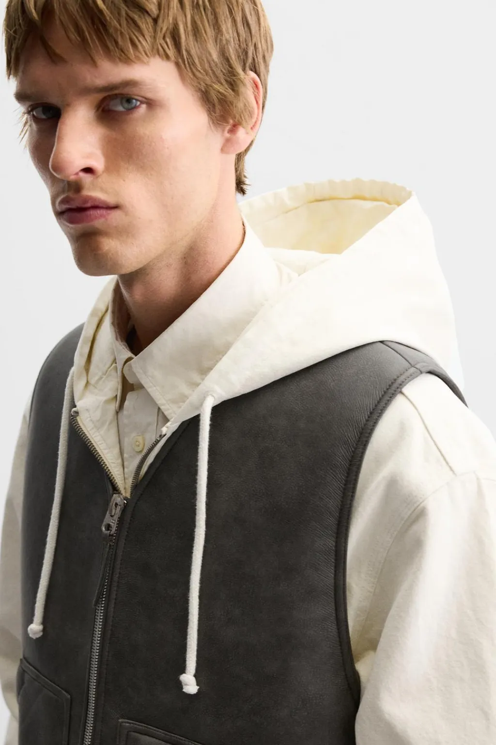 Chaleco relaxed fit confeccionada en tejido efecto piel con el interior de borreguillo combinado a contraste. Cuello pico y manga sisa. Bolsillos plastrón en cadera. Cierre frontal con cremallera.
