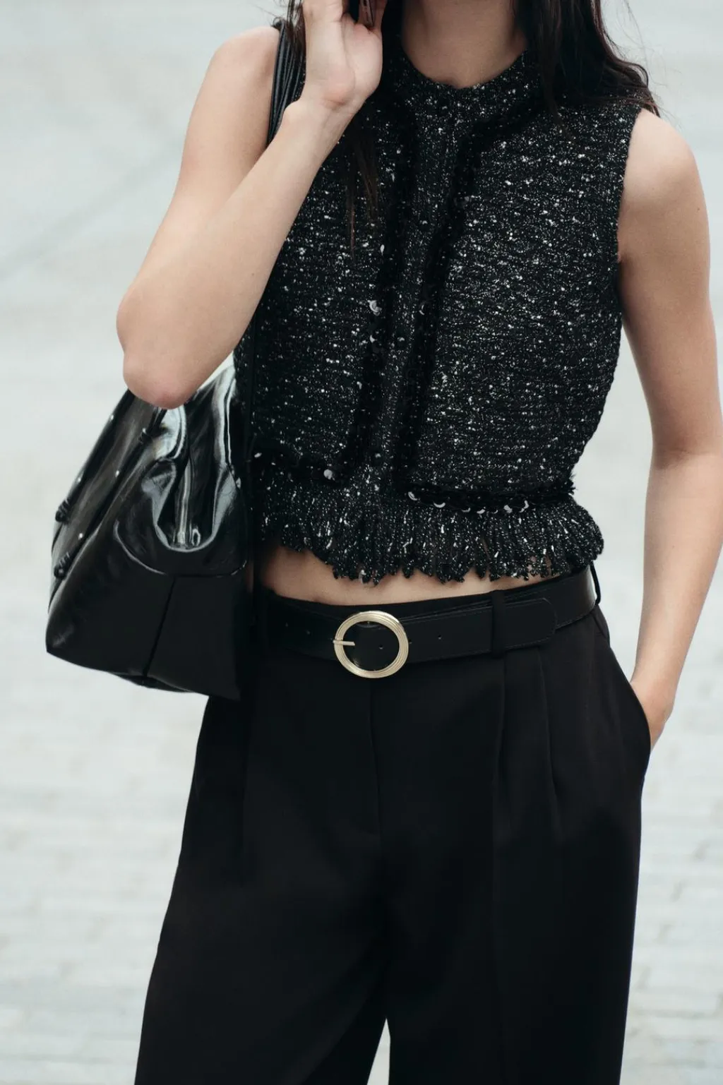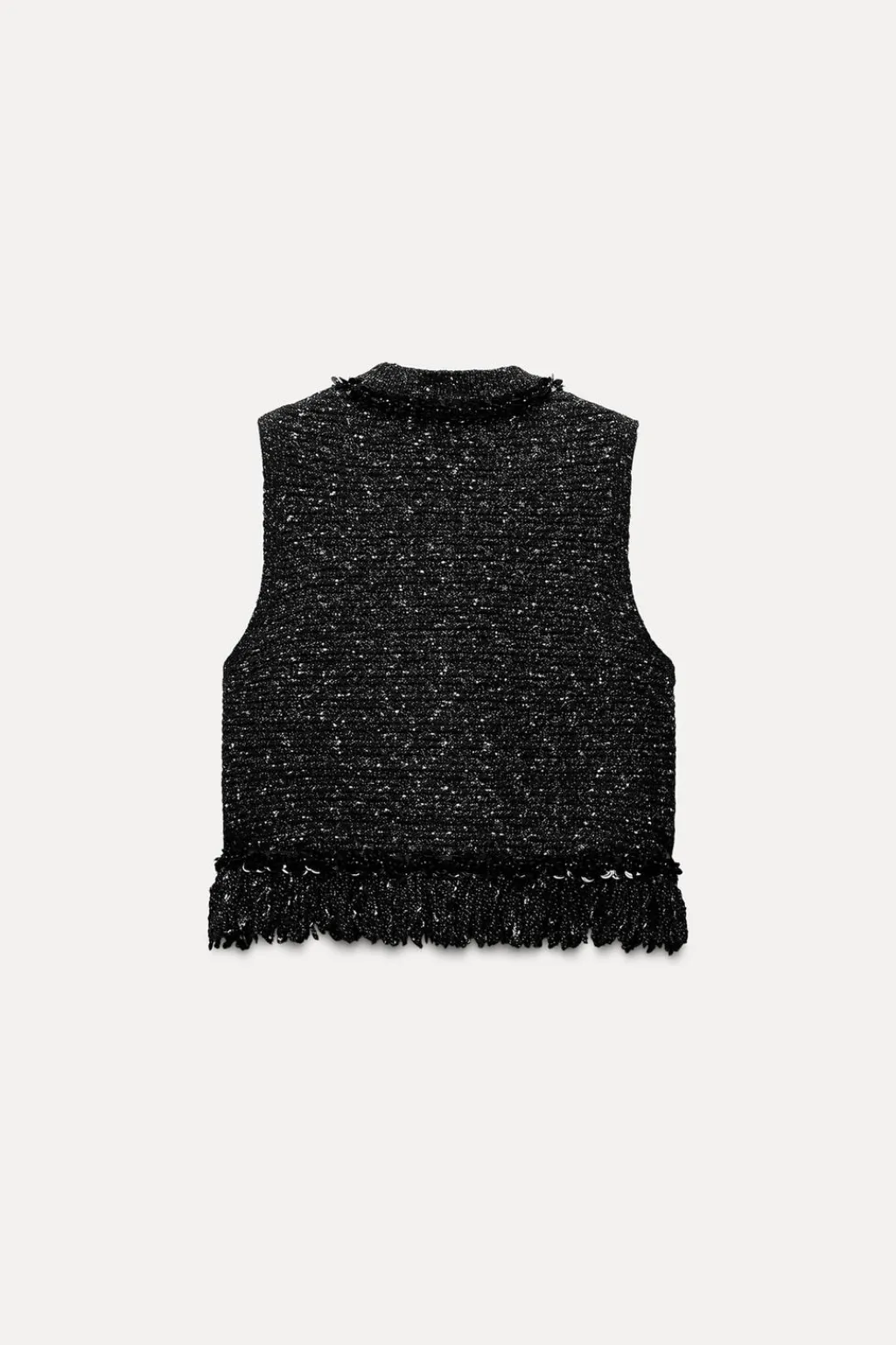 Chaleco de cuello redondo y manga sisa. Detalle de acabados desflecados, hilo metalizado y aplicación de lentejuelas.