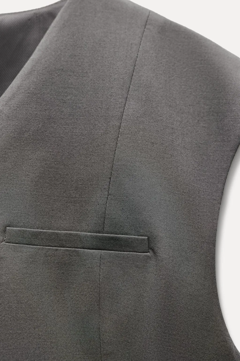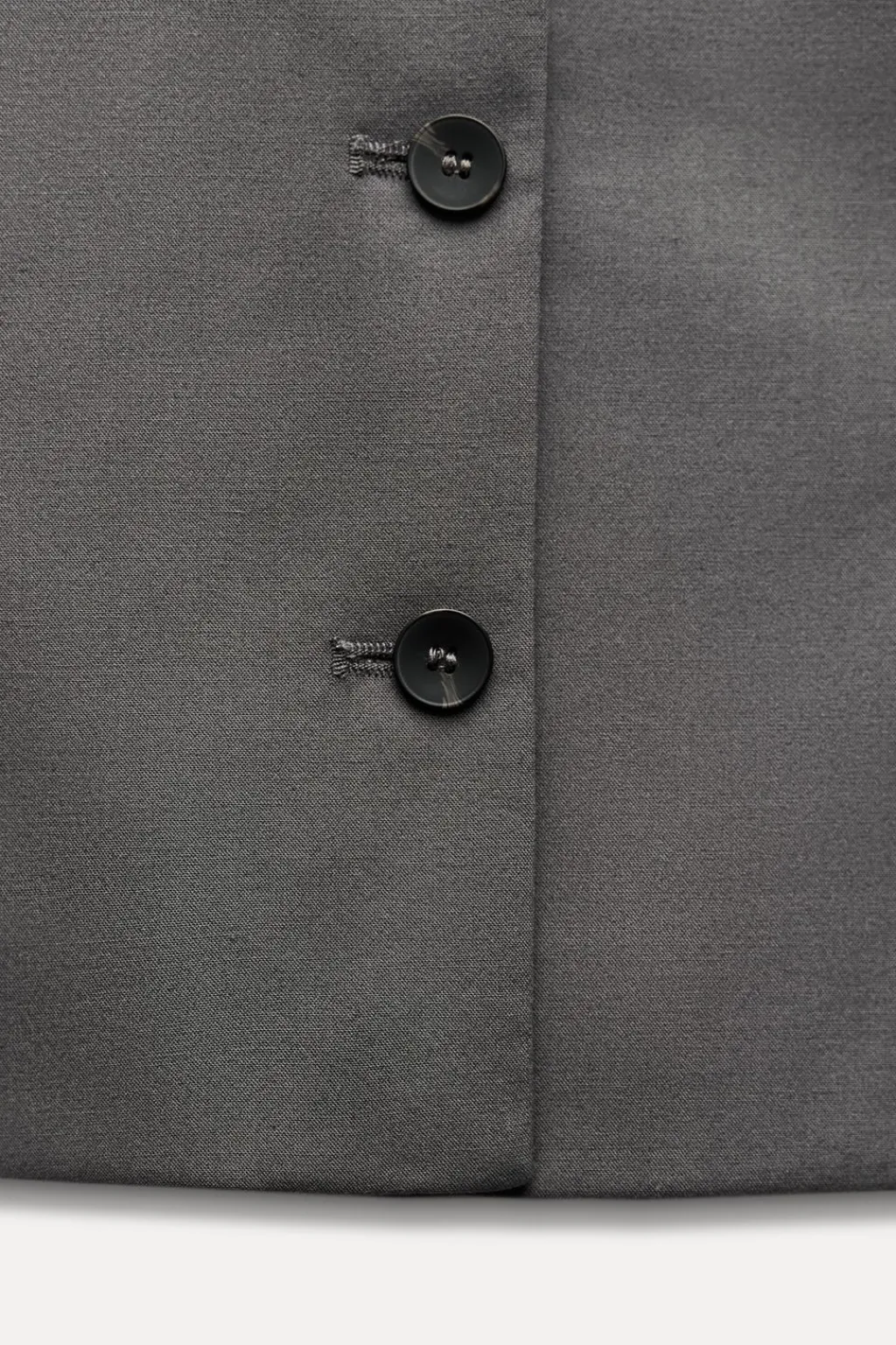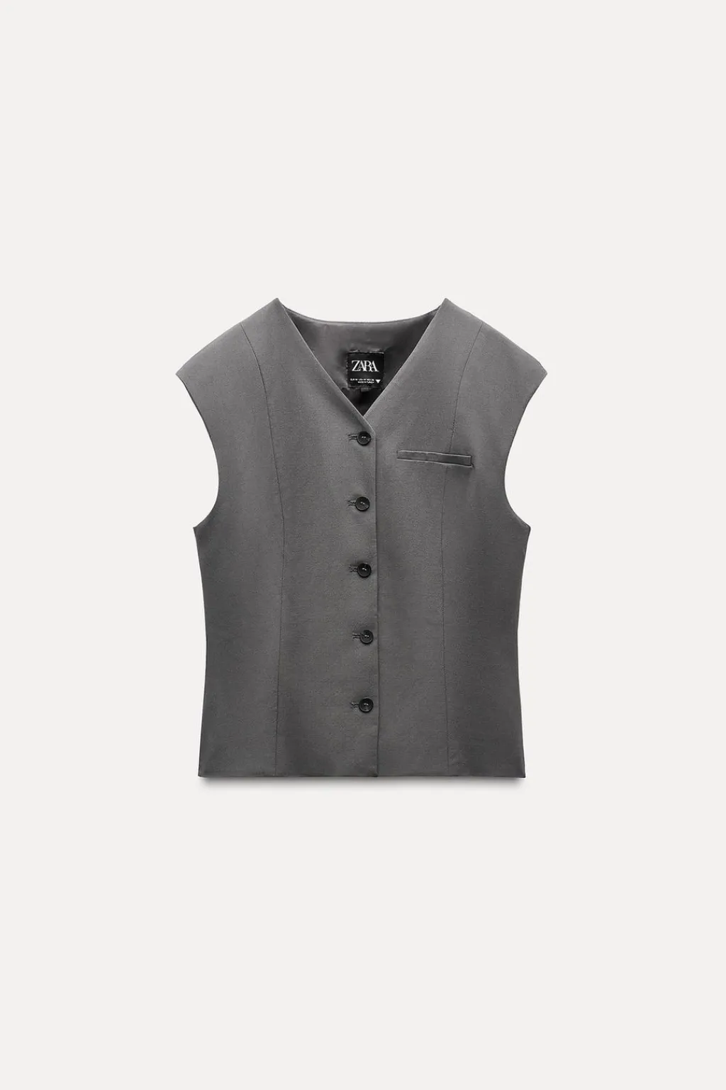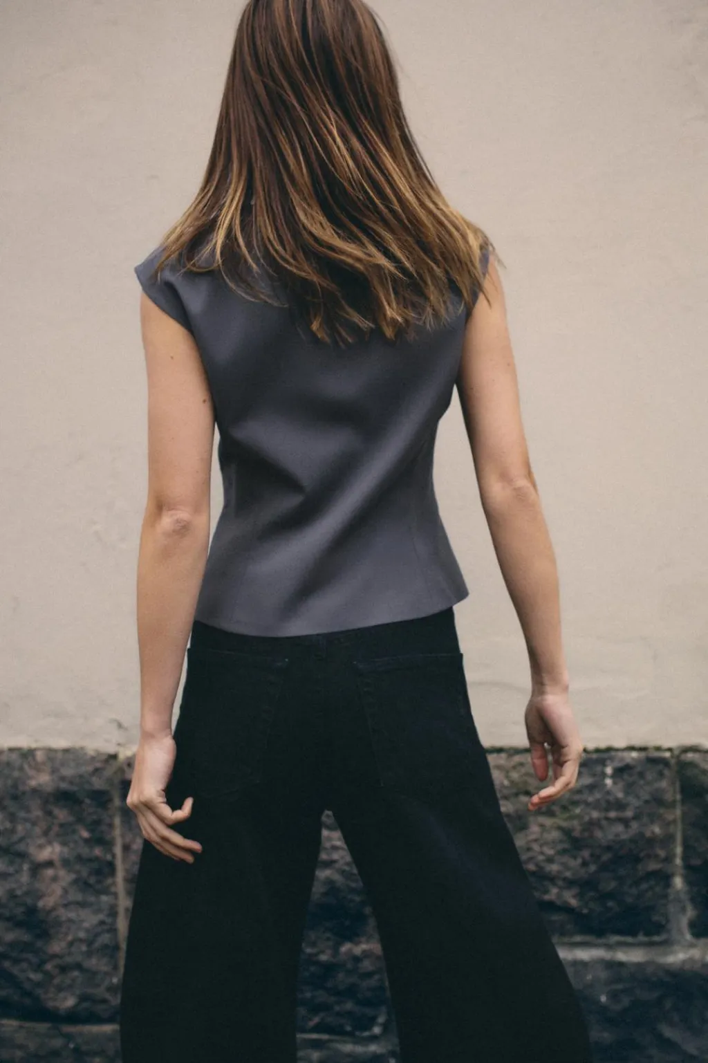 Chaleco top entallado de cuello pico y manga sisa. Falso bolsillo de vivo en pecho. Cierre frontal con botones.