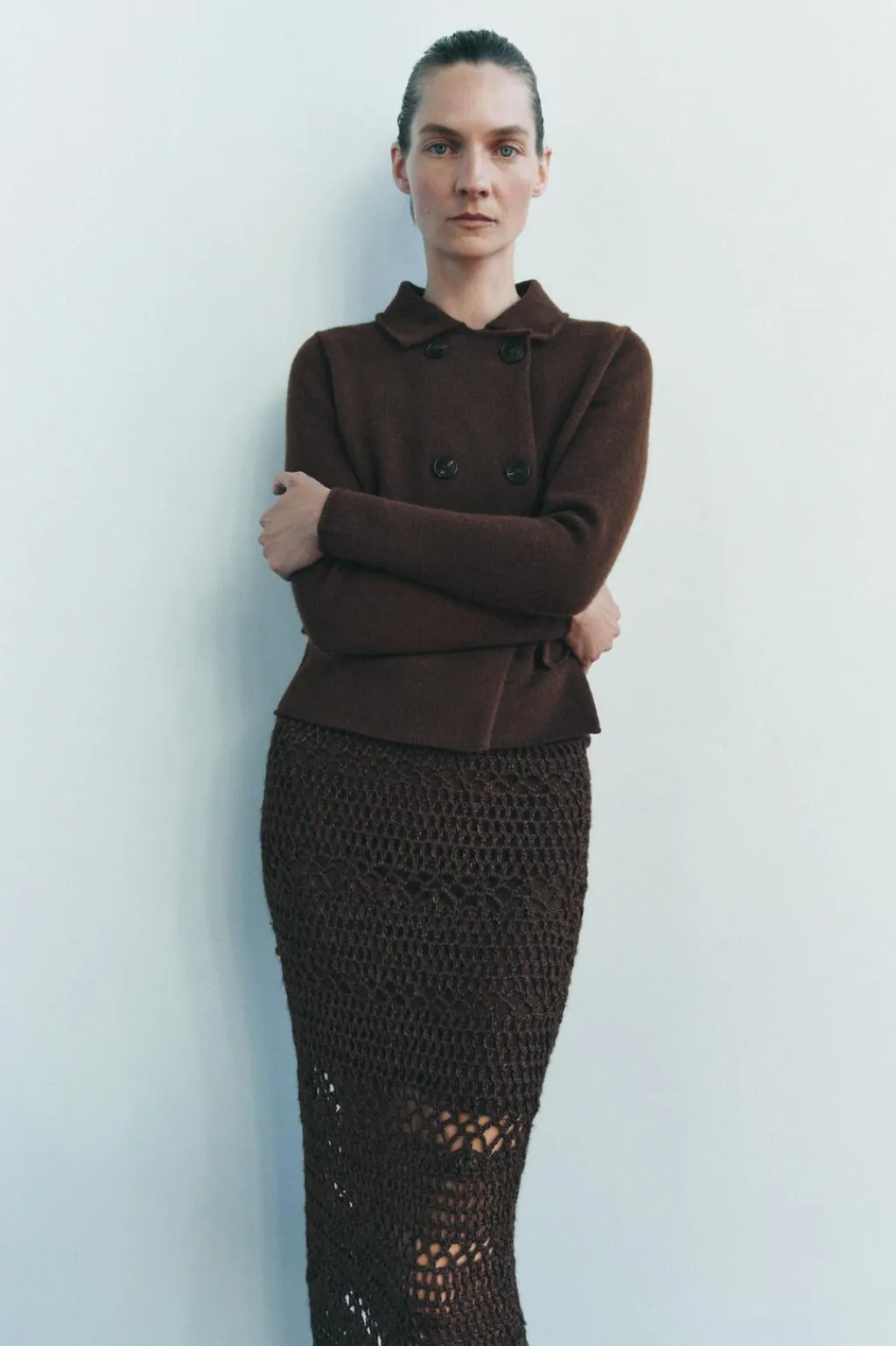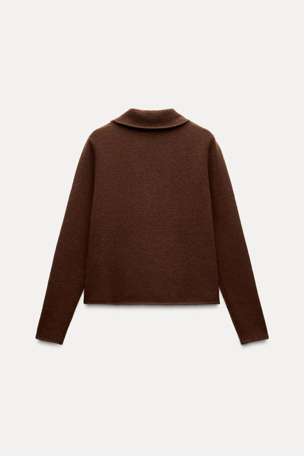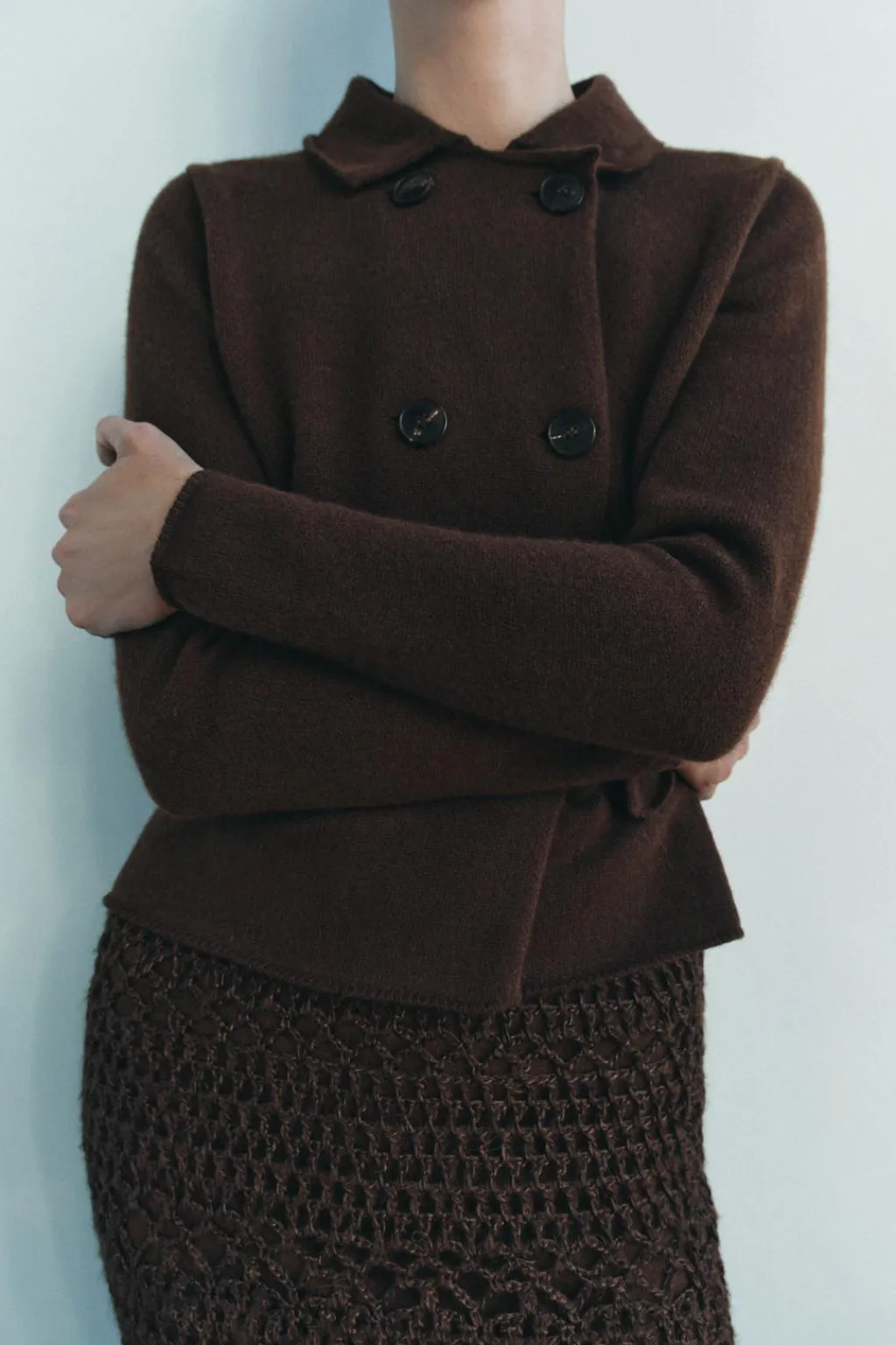 Chaqueta confeccionada en 100% lana. Cuello solapa y manga larga. Detalle de falsos bolsillos delanteros con solapa. Cierre frontal cruzado con botones.