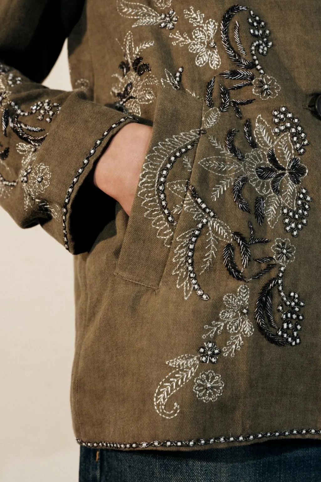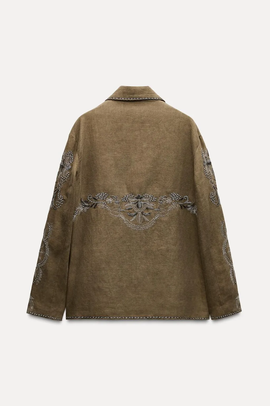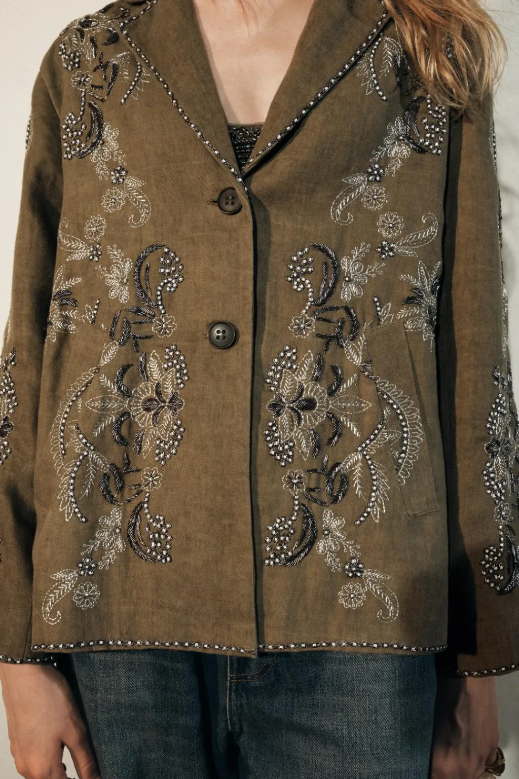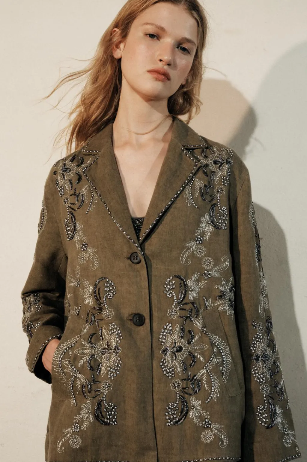Chaqueta confeccionada en hilatura con lino y con algodón. Cuello solapa de muescas y manga larga. DEtalle de bordados a contraste. Bolsillos delanteros. Cierre frontal con botones.