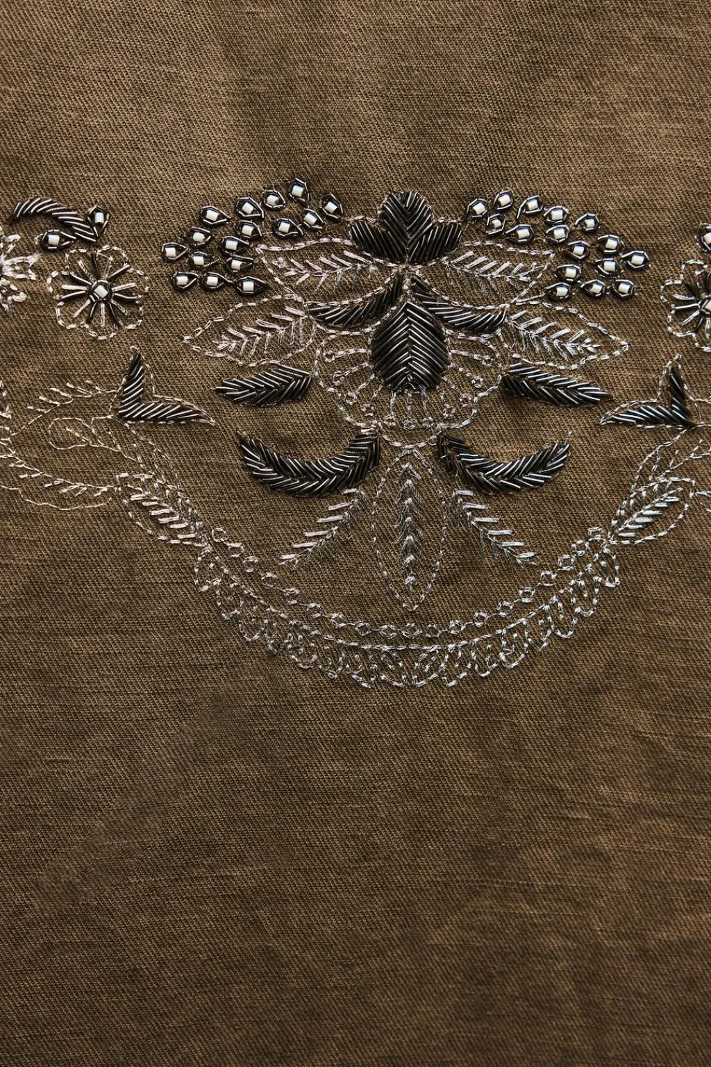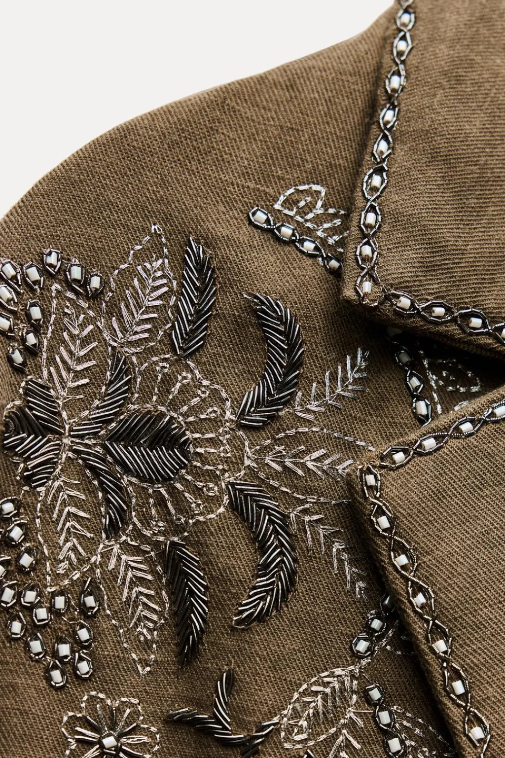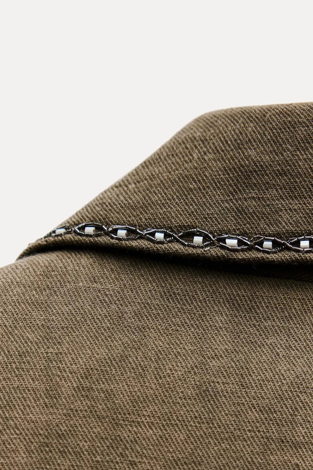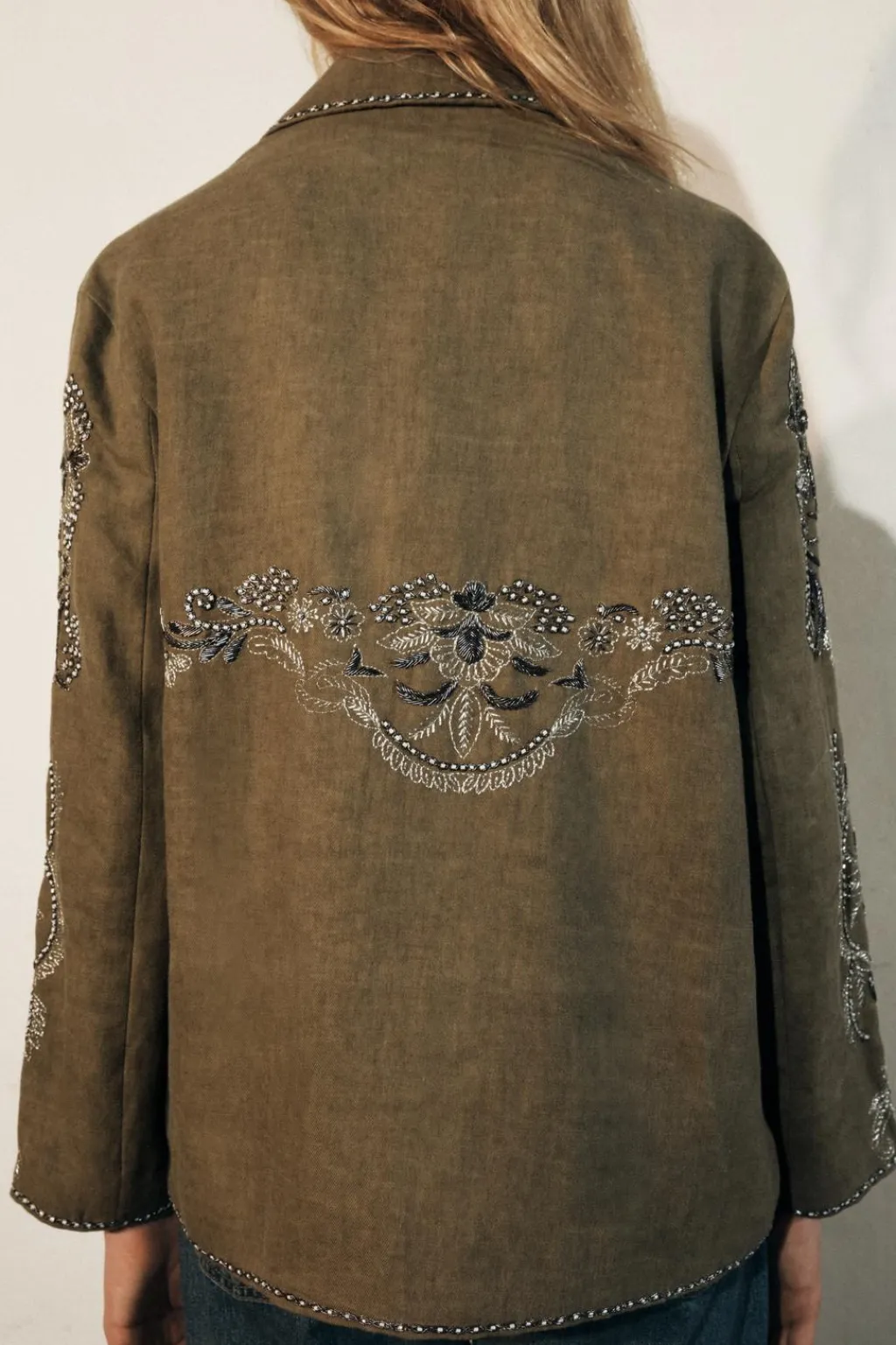 Chaqueta confeccionada en hilatura con lino y con algodón. Cuello solapa de muescas y manga larga. DEtalle de bordados a contraste. Bolsillos delanteros. Cierre frontal con botones.