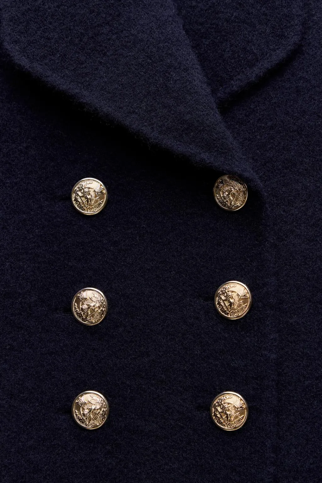 Chaqueta confeccionada en 100% lana. Cuello solapa y manga larga. Cierre frontal cruzado con botones dorados con relieve.