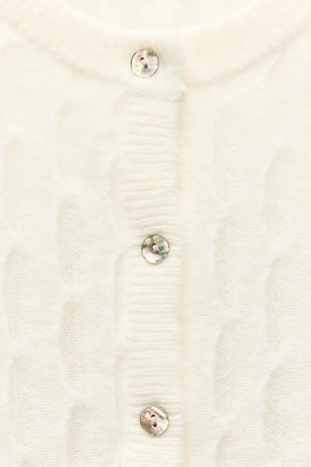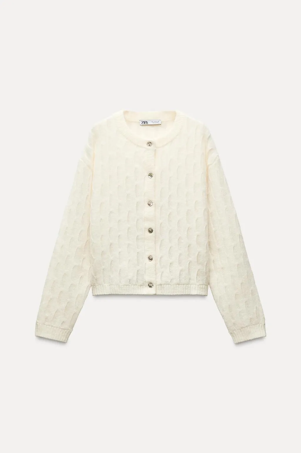 Chaqueta confeccionada con lana. Cuello redondo y manga larga. Detalle de tejido con formas de ondas. Cierre frontal con botones. Acabados en rib.
