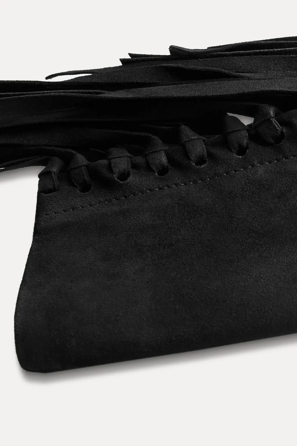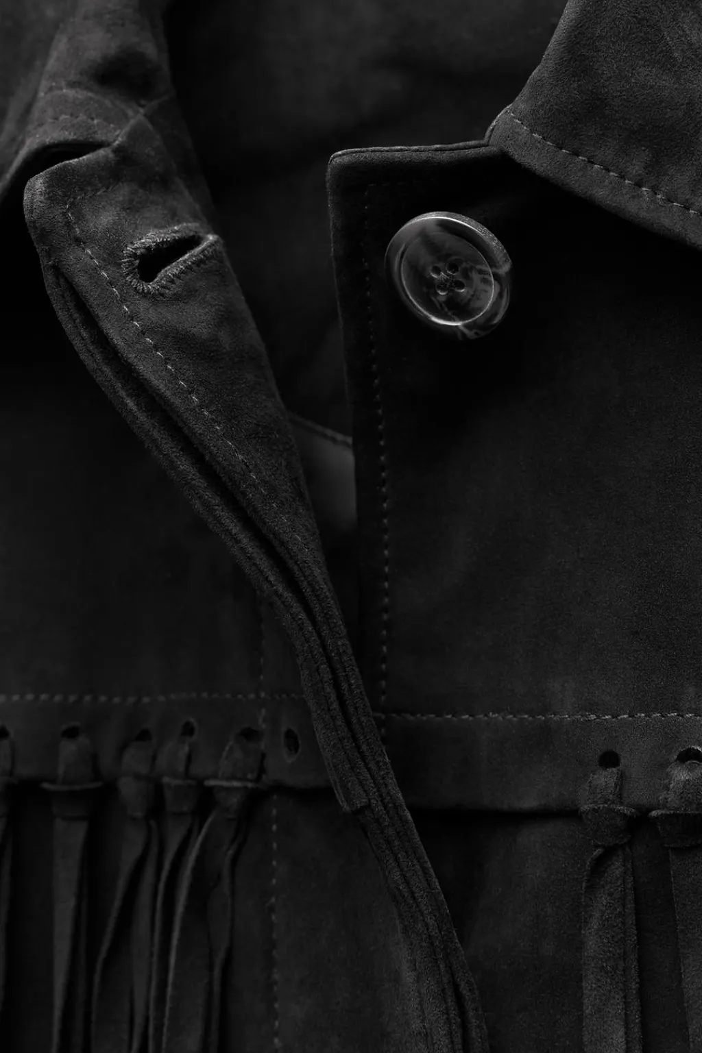 Chaqueta realizada en piel de ante 100%. Cuello solapa y manga larga. Bolsillos de plastrón en delantero. Detalle de flecos en mismo tejido. Cierre frontal con botones ocultos por solapa.