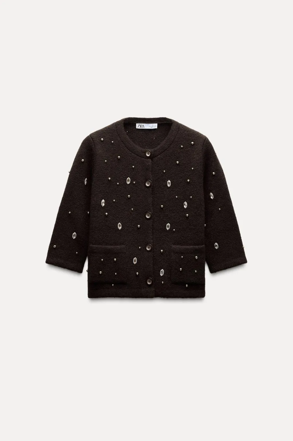Chaqueta de cuello redondo y manga por debajo del codo. Bolsillos delanteros de plastrón. Detalle de aplicación de abalorios joya. Cierre frontal con botones.