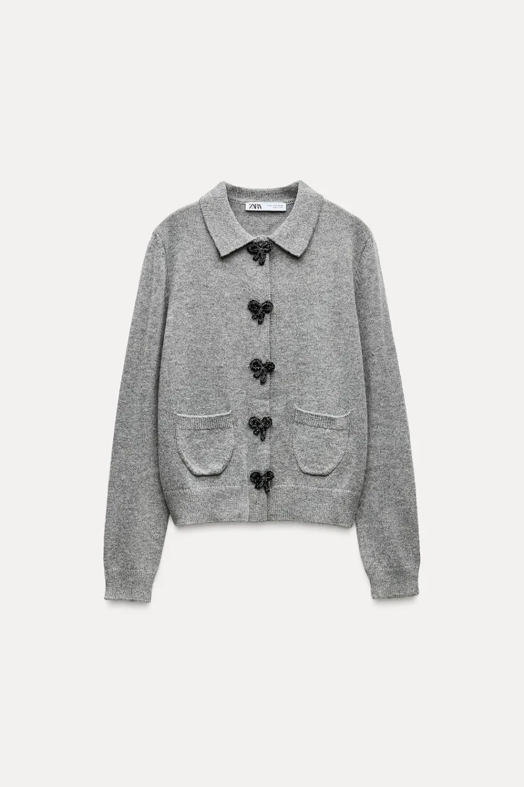Chaqueta de cuello solapa y manga larga. Bolsillos delanteros de plastrón. Acabados en rib. Cierre frontal con botones a presión en forma de lazo.