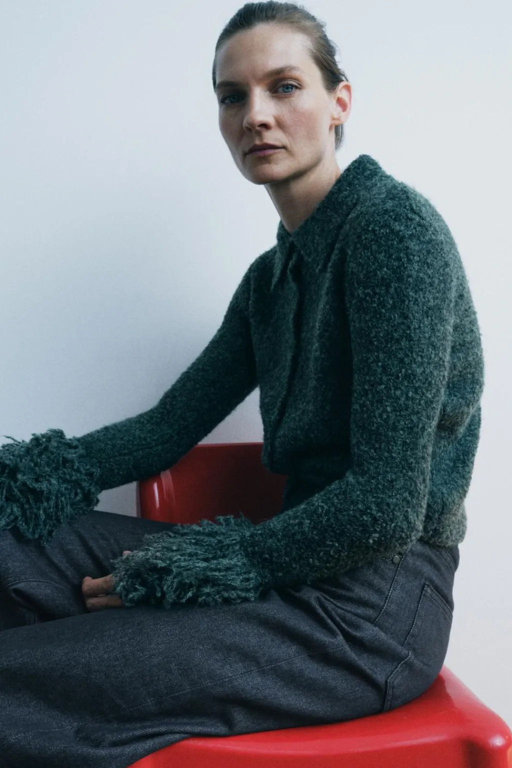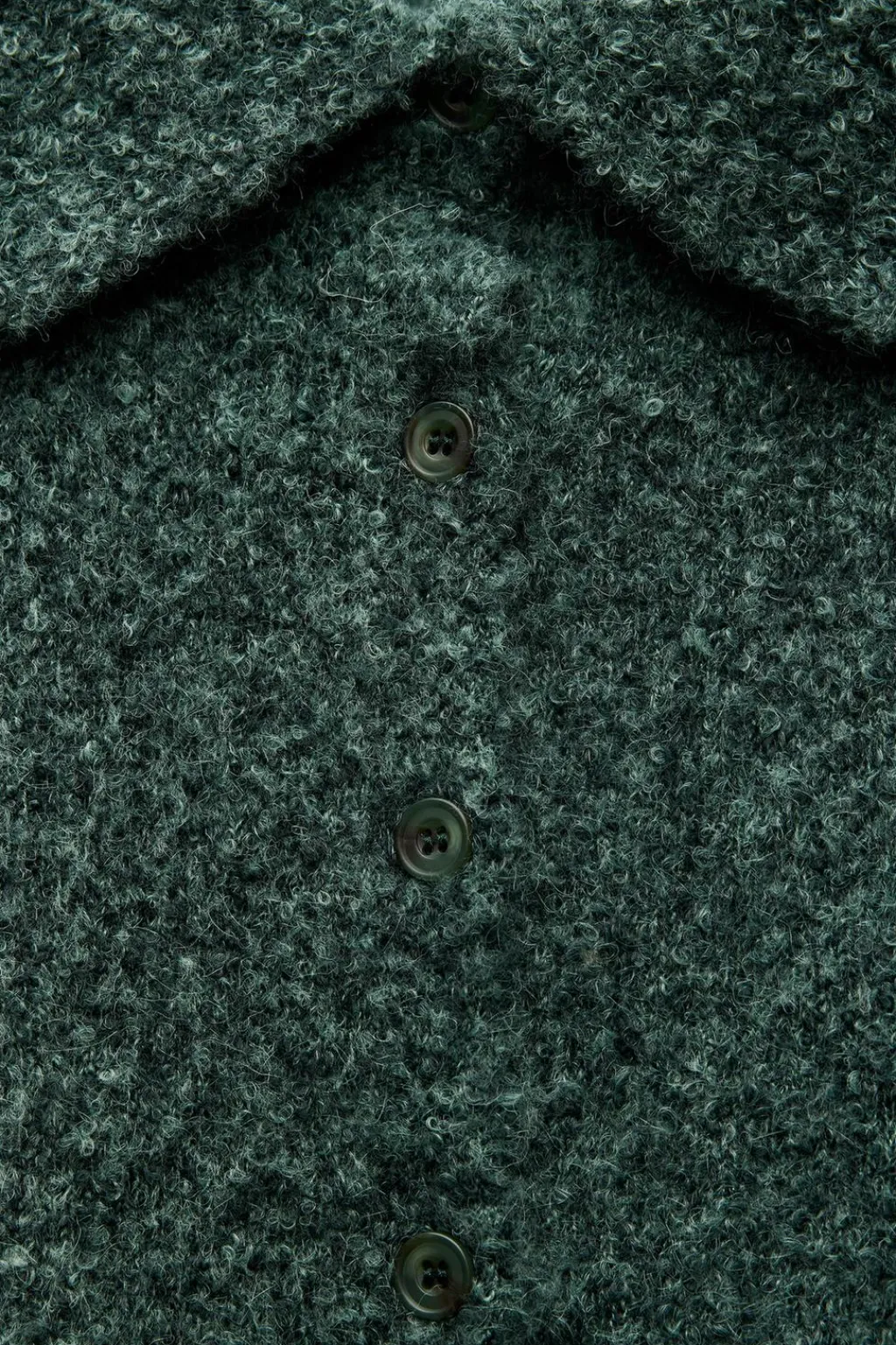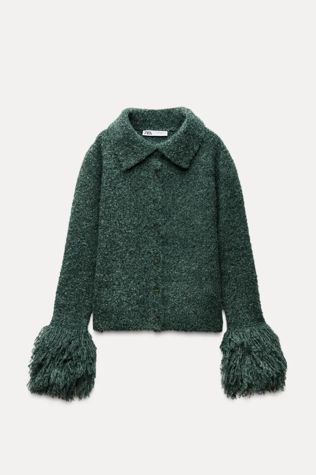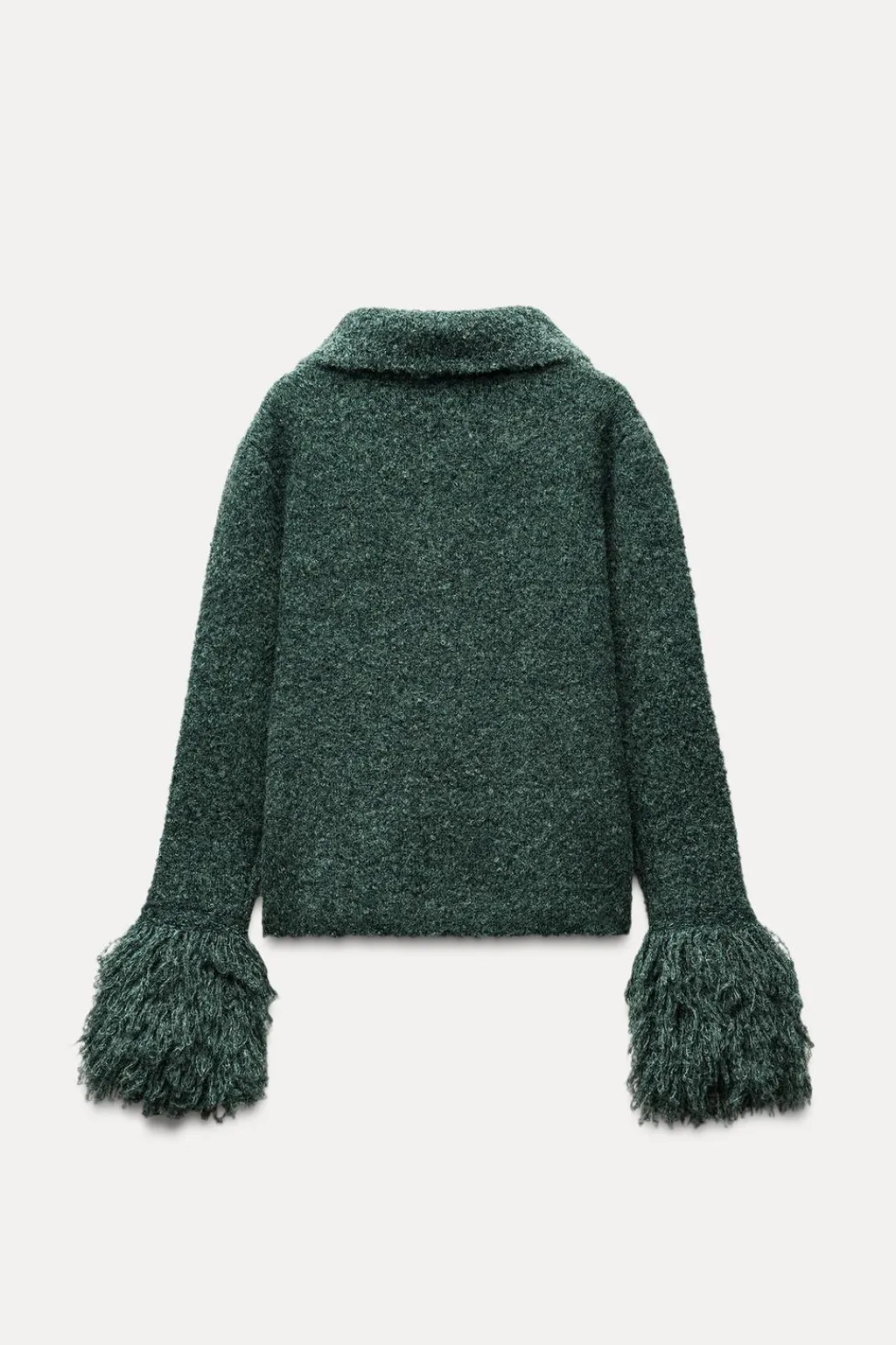 Chaqueta de cuello solapa y manga larga acabada con flecos. Cierre frontal con botones.