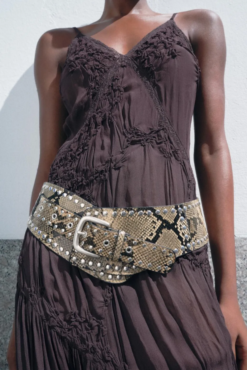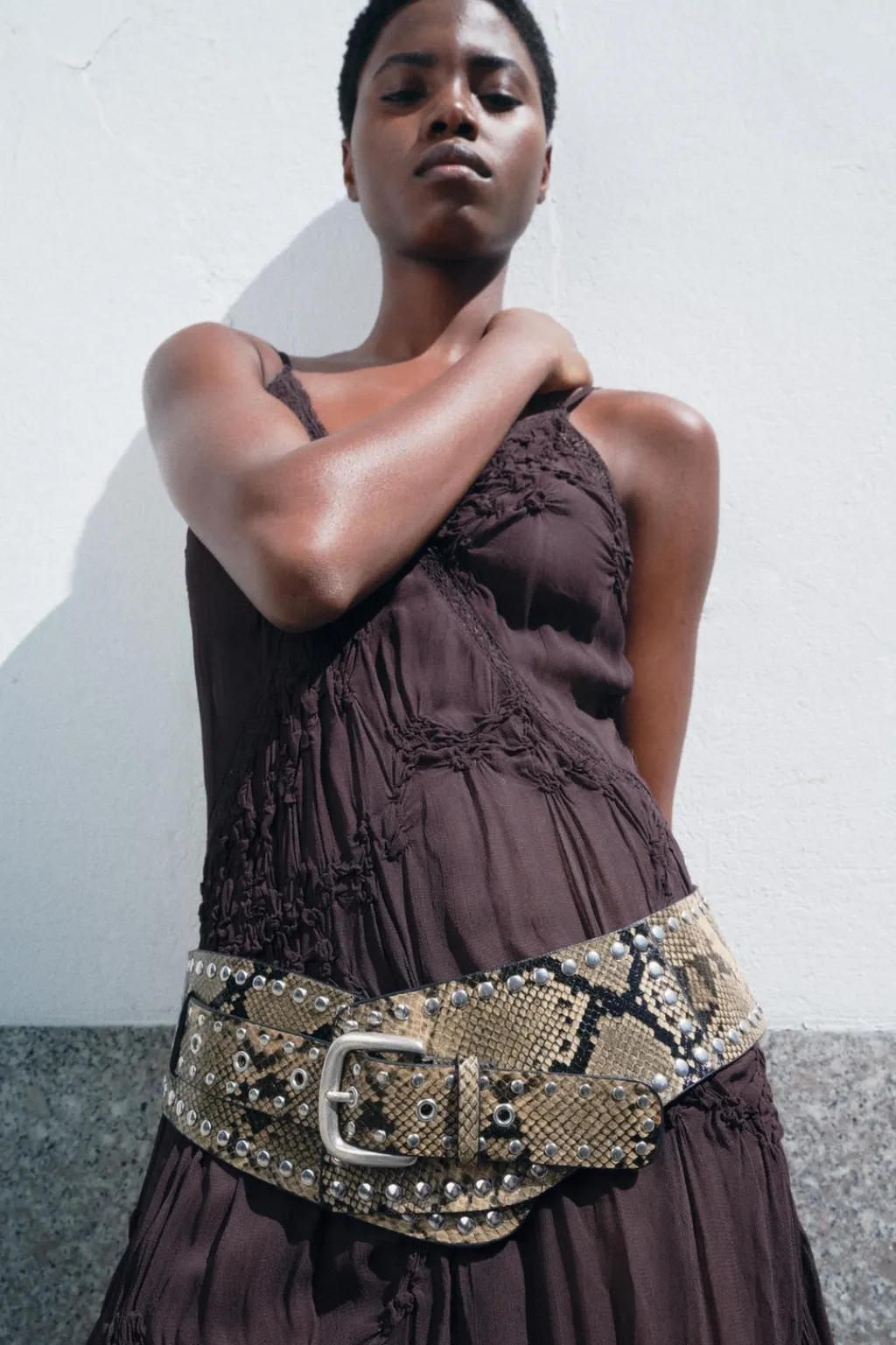Cinturón tipo fajín de 11 cm de ancho realizado en piel. Detalle aplicación de tachas combinadas a contraste. Hebilla metálica cuadrada.