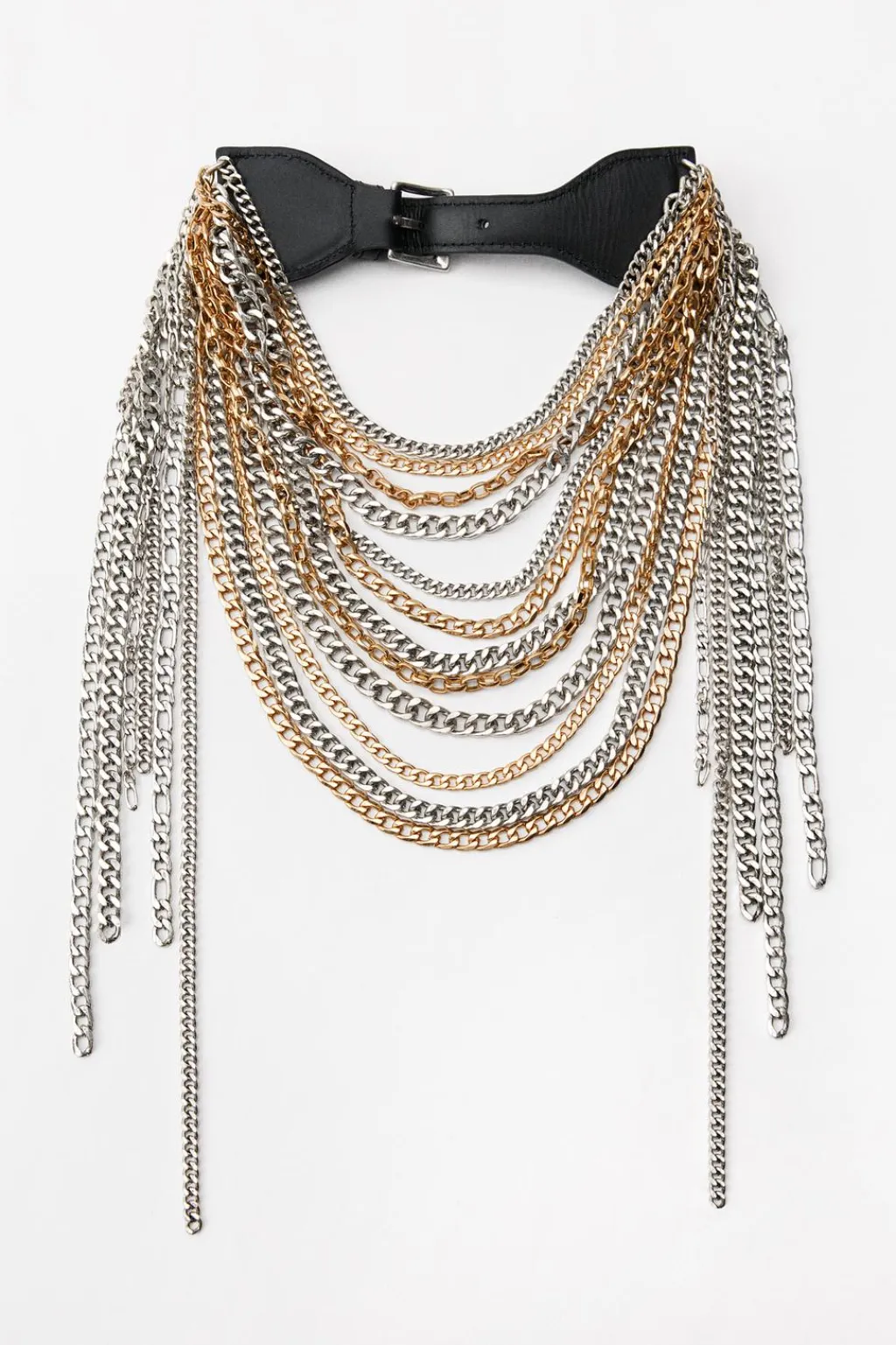 Collar de múltiples cadenas de eslabones metálicos. Cierre realizado en piel con hebilla metálica.