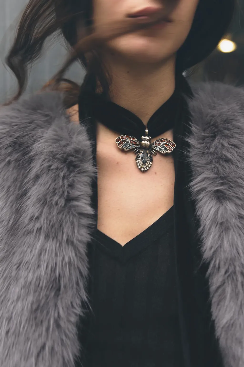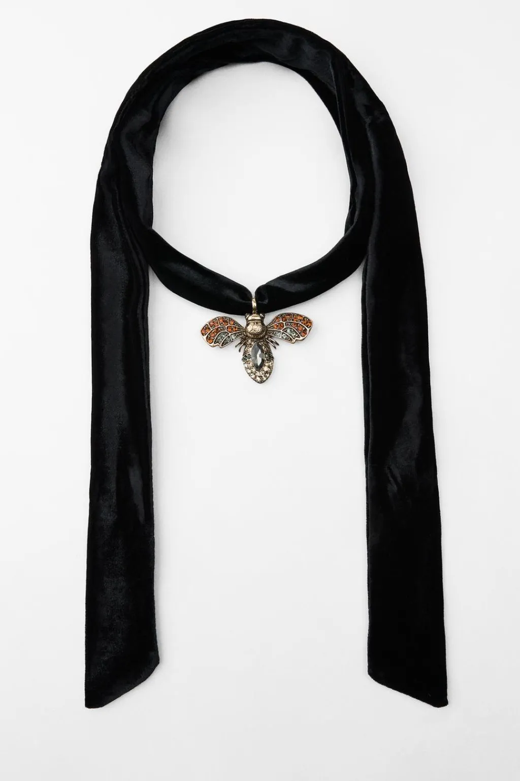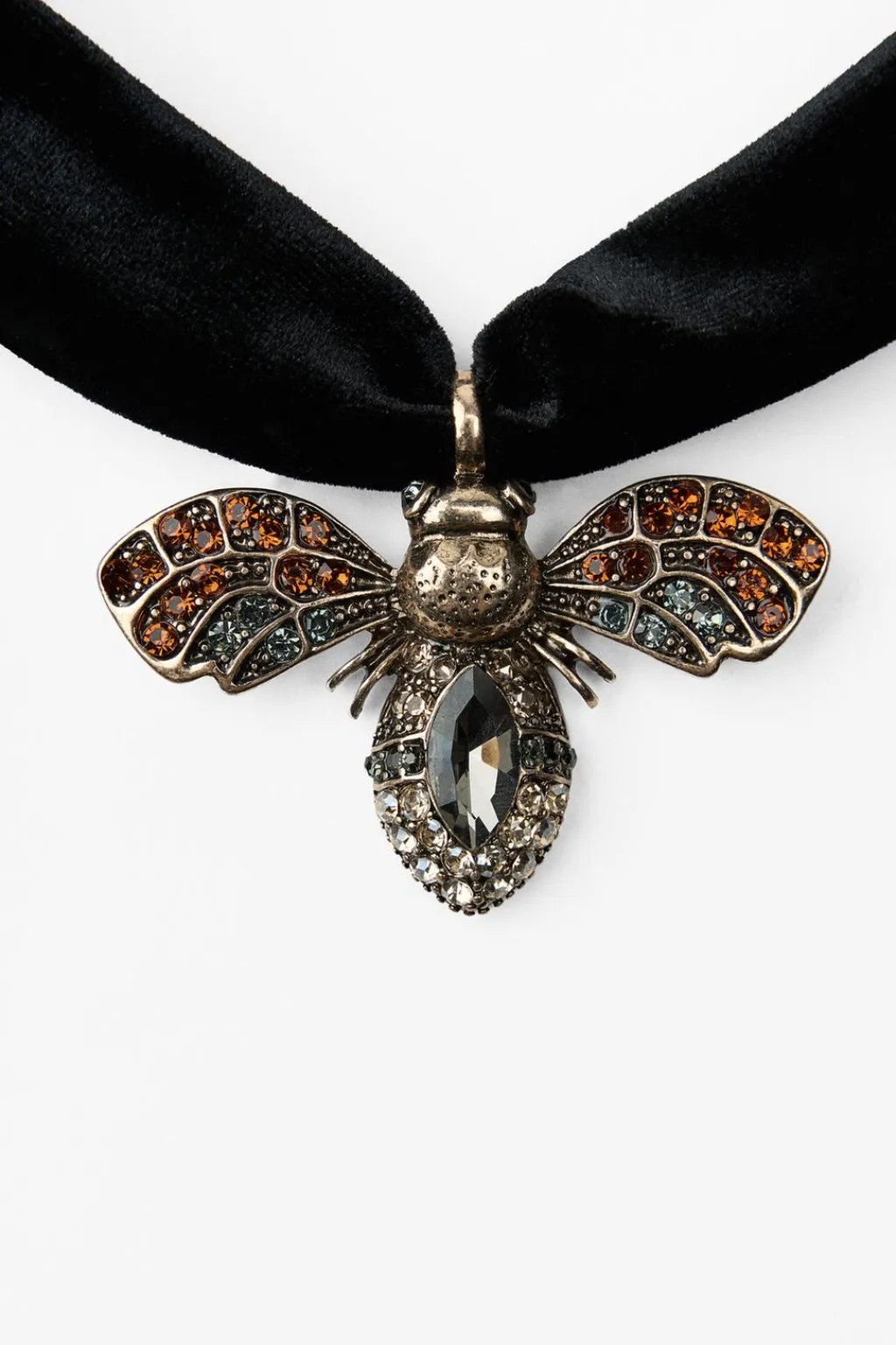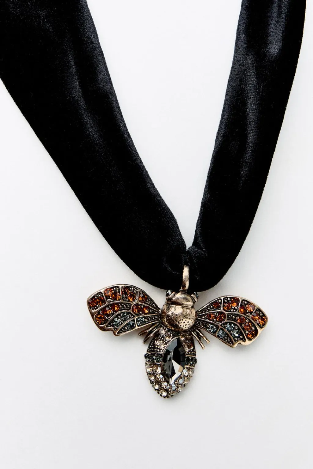 Collar largo confeccionado en tejido de terciopelo. Colgante metálico en forma de abeja con aplicación de joyas combinadas a contraste. Cierre con lazada.