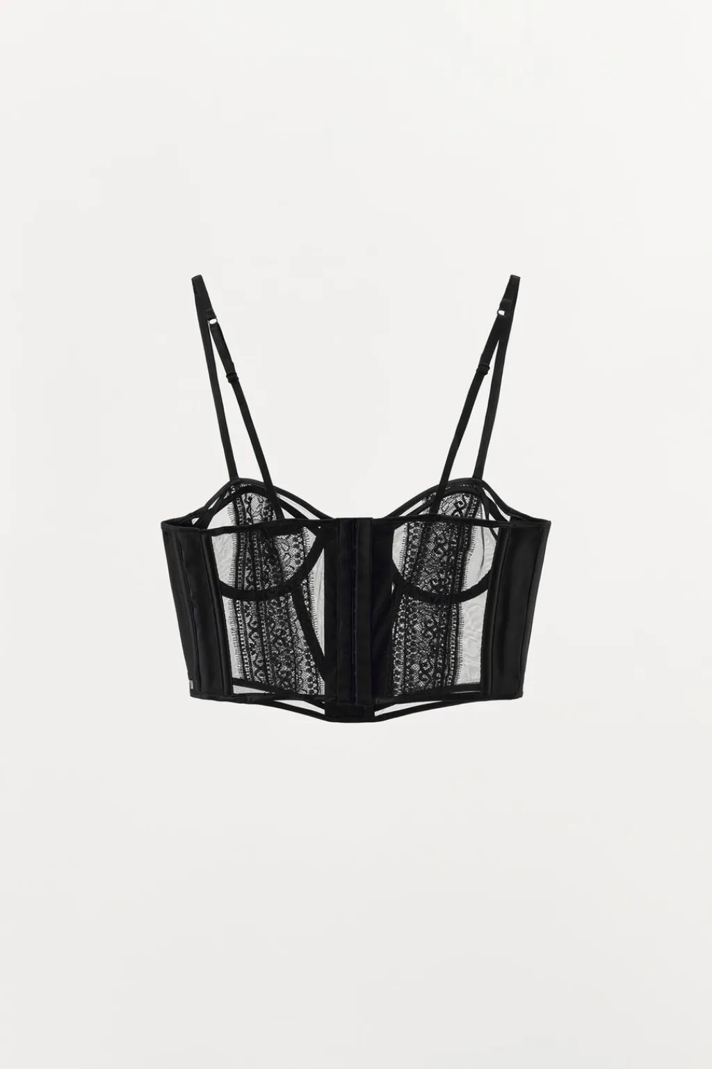 Corsé semitransparente confeccionado en encaje suave con aros. Escote corazón y tirantes finos ajustables. Varillas ocultas en costura para realzar y estilizar la figura. Cierre frontal con ganchos metálicos.