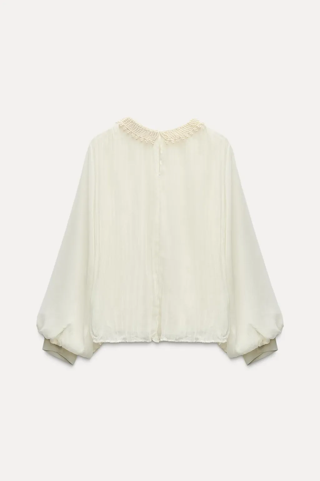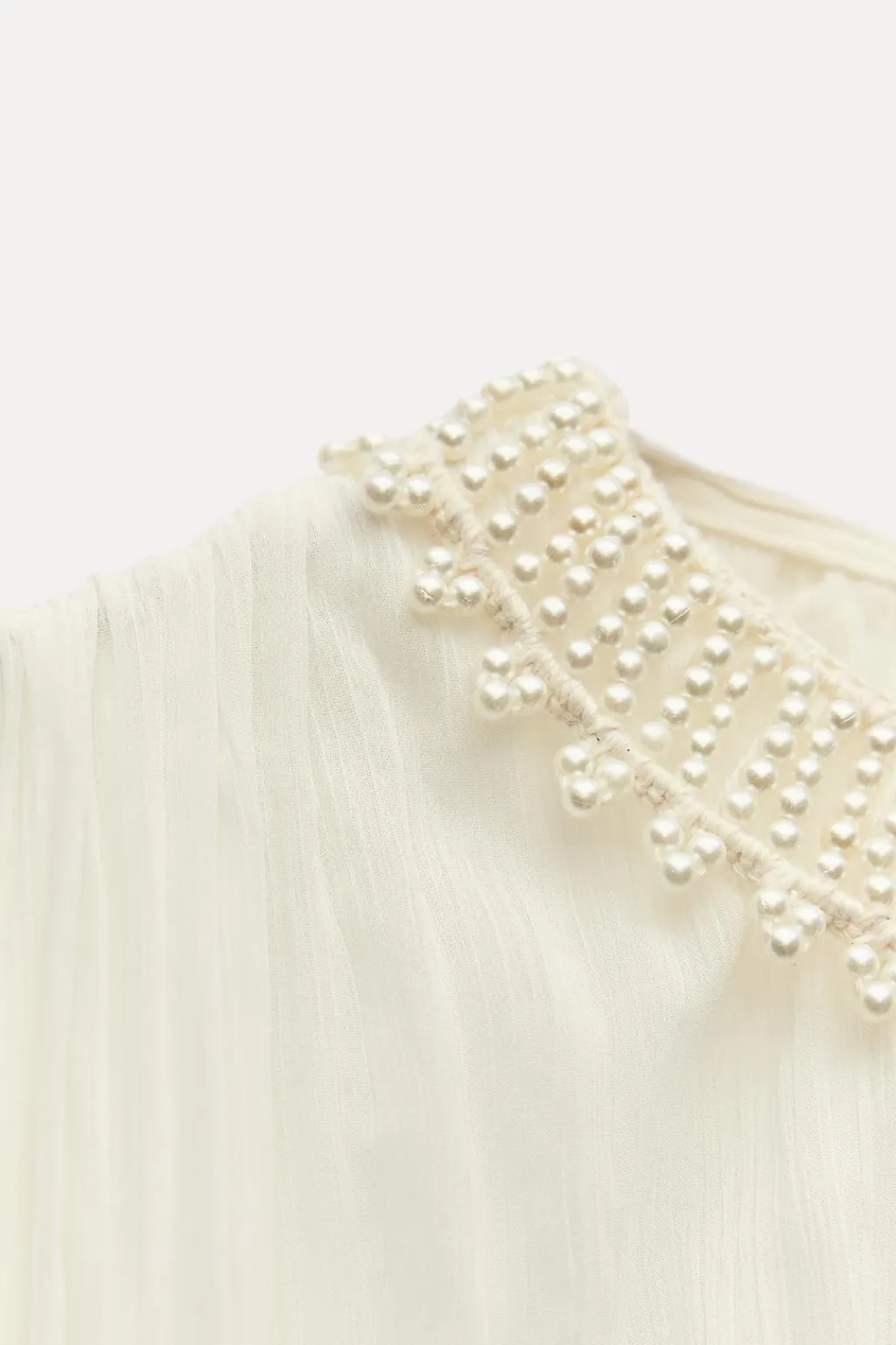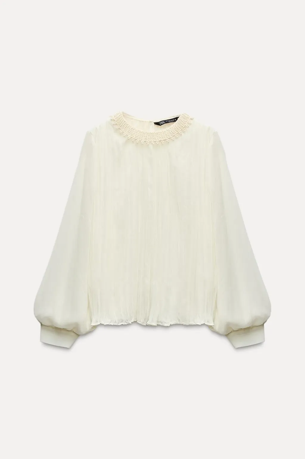 Cuerpo de cuello redondo con perlas y manga larga. Detalle de tejido efecto arrugado. Cierre en espalda con abertura y botón oculto.