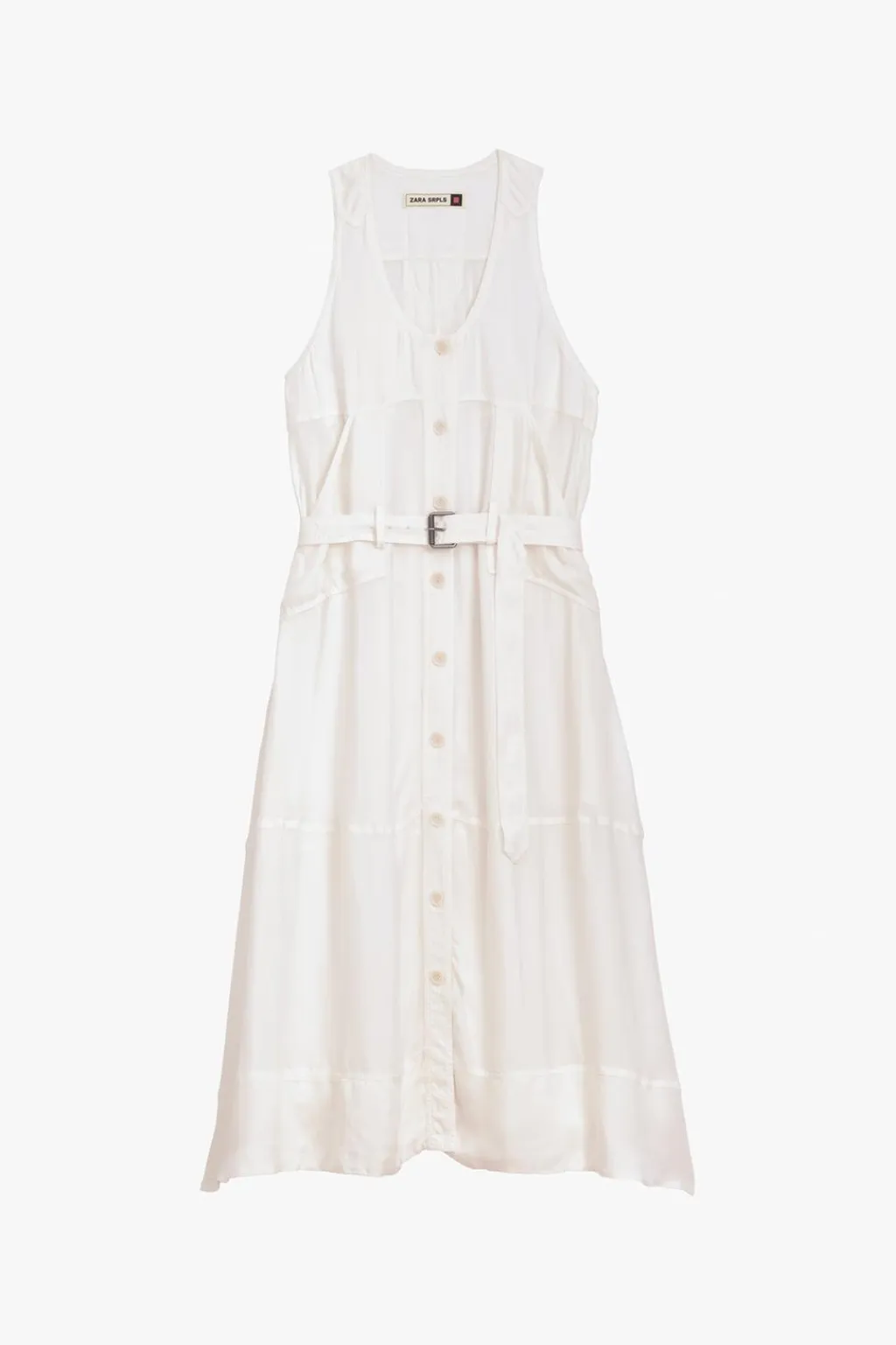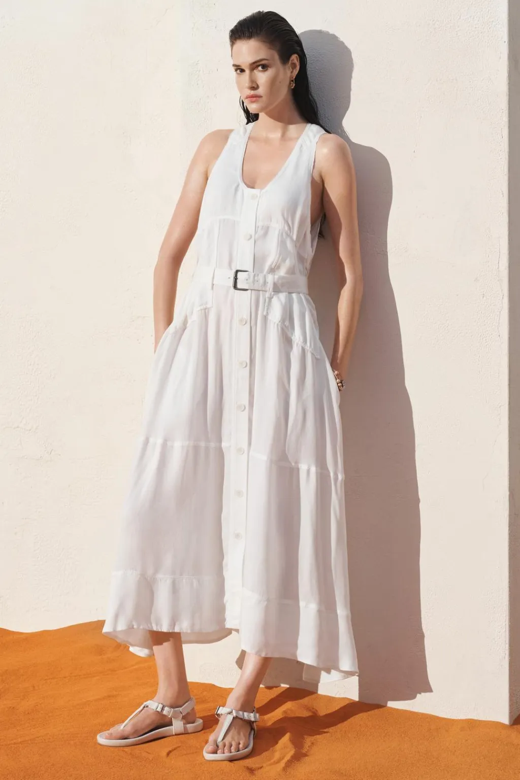 Vestido largo fluido confeccionado en hilatura de cupro 100%. Escote redondo y manga sisa. Bolsillos laterales ocultos en costura. Cinturón en mismo tejido ajustable con hebilla metálica. Detalle de pespuntes marcados combinados a tono. Cierre frontal con botones.